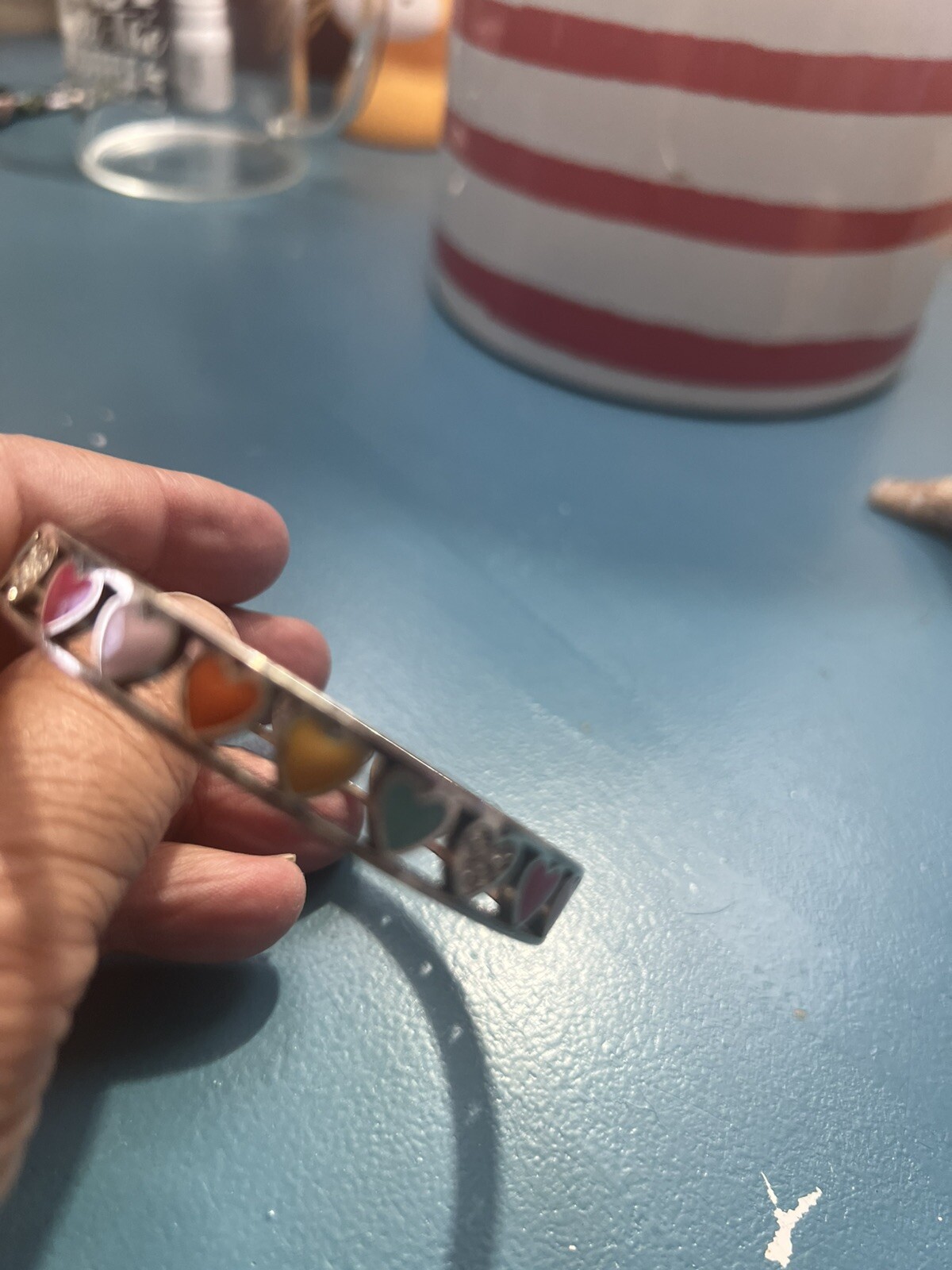 This Brighton Bon Bon Hearts Bangle Bracelet is a rare and retired piece perfect for Valentine's Day. The bracelet features a colorful enamel designcreating a lovely and festive look. With a bangle style and silver plated metal, this bracelet is designed for females and is a statement piece that exudes elegance and charm. Perfect for adding a pop of color and sparkle to any outfit, this Brighton bracelet is a must-have for any jewelry collection.
