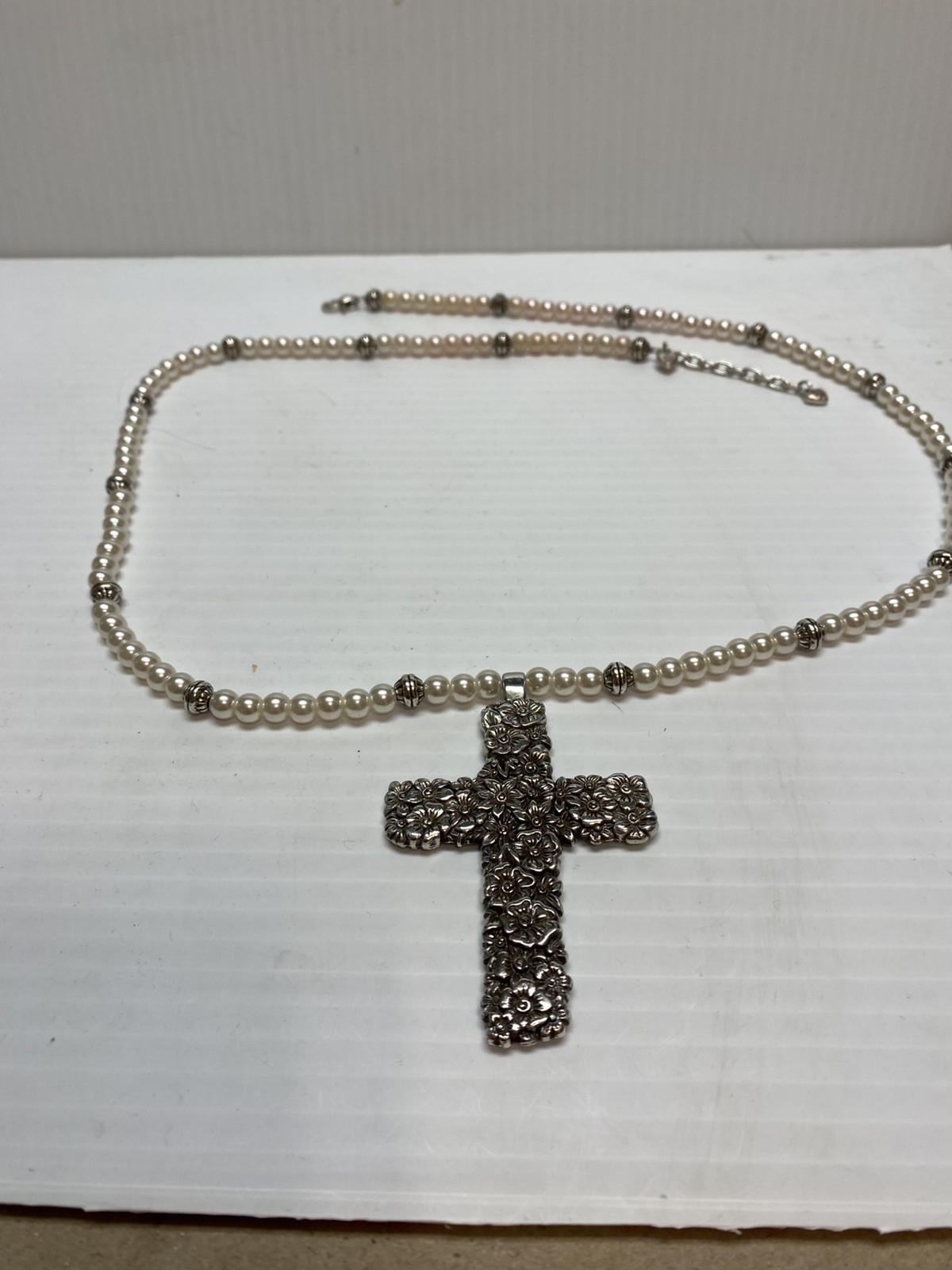 This beautiful Brighton necklace features a silver tone cross pendant with pearl and silver beaded details. The long necklace measures 32-34 inches in length and is perfect for any occasion. The charm pendant is in the shape of a cross and is a lovely addition to any jewelry collection. The necklace is in excellent condition and is sure to make a great addition to yours.