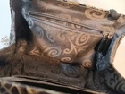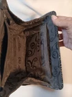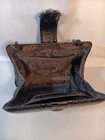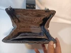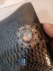 This gorgeous Brighton clutch/shoulder bag is a must-have for any formal occasion or party. The bag features a unique jeweled and snake skin leather exterior, with silver hardware and a chain shoulder strap. It has a magnetic multi-compartment storage wallet organizer clutch closure, and includes inside pockets with multi-slit and 1 zipper pockets for added convenience. The bag is small in size, measuring 7 1/2 inches in width, 5 1/4 inches in height, and 2 1/2 inches in depth. It comes with a detachable strap and original dust bag, and is part of the Brighton Collection. The bag is designed with bottom studs and soft pewter leathers, making it a perfect addition to your evening and night use. The bag is a rare and unique find, and is sure to be a great conversation starter.