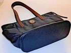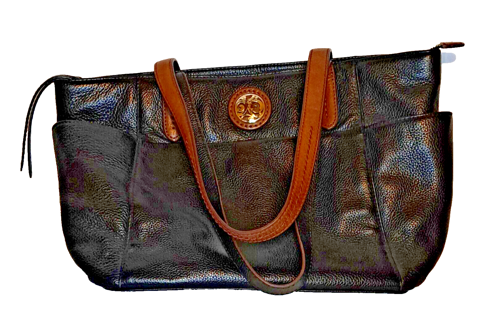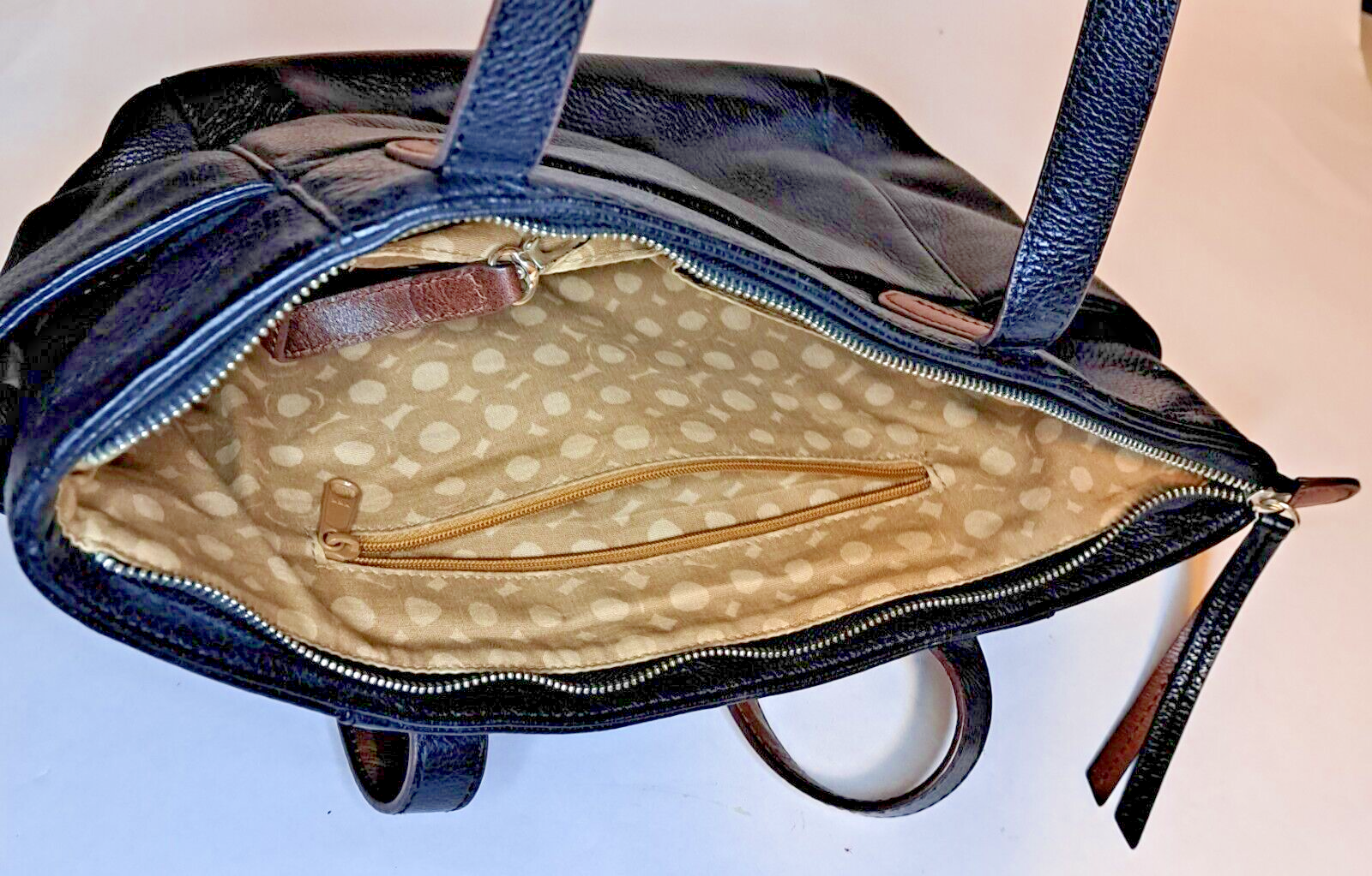 This stylish black leather tote from Brighton London is both practical and chic. The soft genuine leather, elegant brown trim, and etched hardware give it a sophisticated look, while the roomy interior and multiple pockets keep everything organized. It’s perfect for everyday use, whether for work or outings. The zip closure and included key holder add extra convenience. Love the attention to detail—such a high-quality find for a discontinued piece!