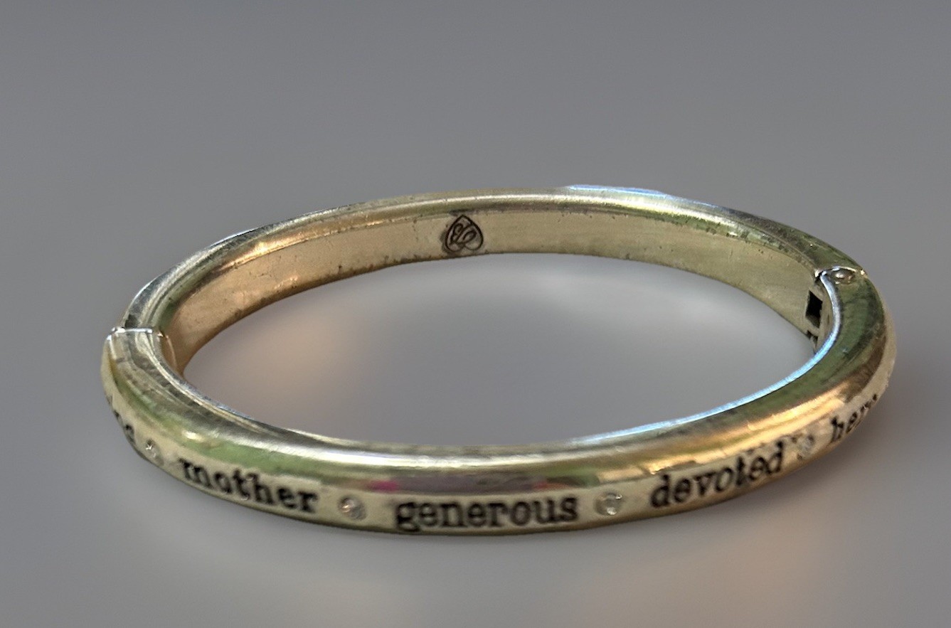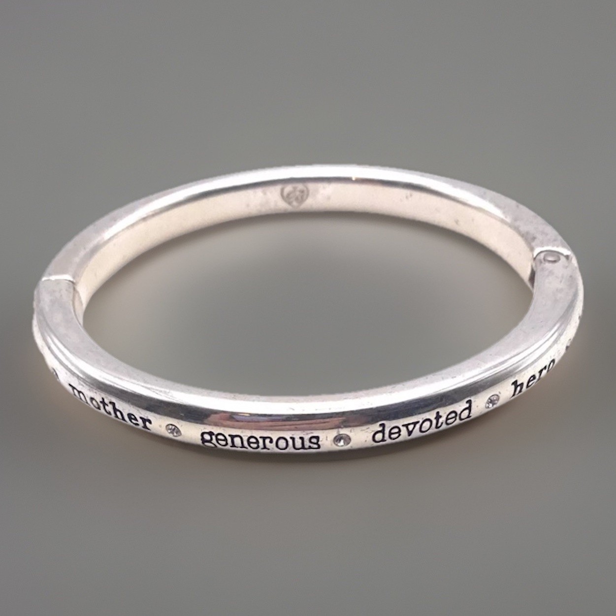 The Brighton "Love Mom Inspirational" Silver Tone with Crystal Oval Bangle Bracelet is a beautiful and meaningful piece of jewelry perfect for special occasions like Mother's Day, weddings, anniversaries, birthdays, and more. Made of silver plated metal, the bracelet features a round white/colorless crystal as the main stone, with a total of 10 crystals included. The magnetic closure makes it easy to put on and take off, and its bangle style adds a stylish touch to any outfit. The signature Brighton brand and the "Love Mom" theme make this bracelet a unique and heartfelt gift for your mother or a significant other.