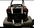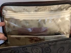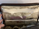 This bag is new and has never been used it still has the cardboard packaging bands. There's 3 bottles included that meet the size requirements for toiletries. The registration card is also included
