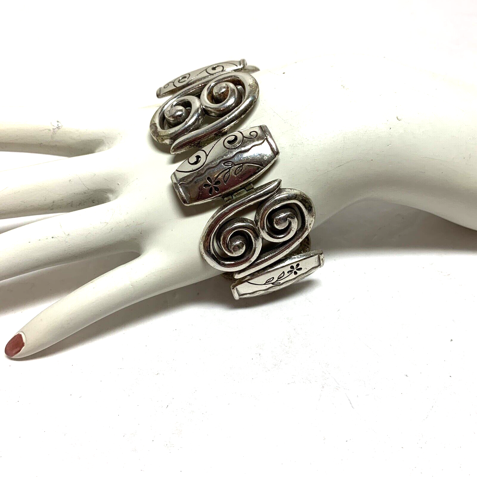 The Brighton Pablo's Passion Wide Silver-tone Link Bracelet features a rectangular shape with a floral swirl design in a silver color. The bracelet is 7.75 inches in length and has a lobster closure.