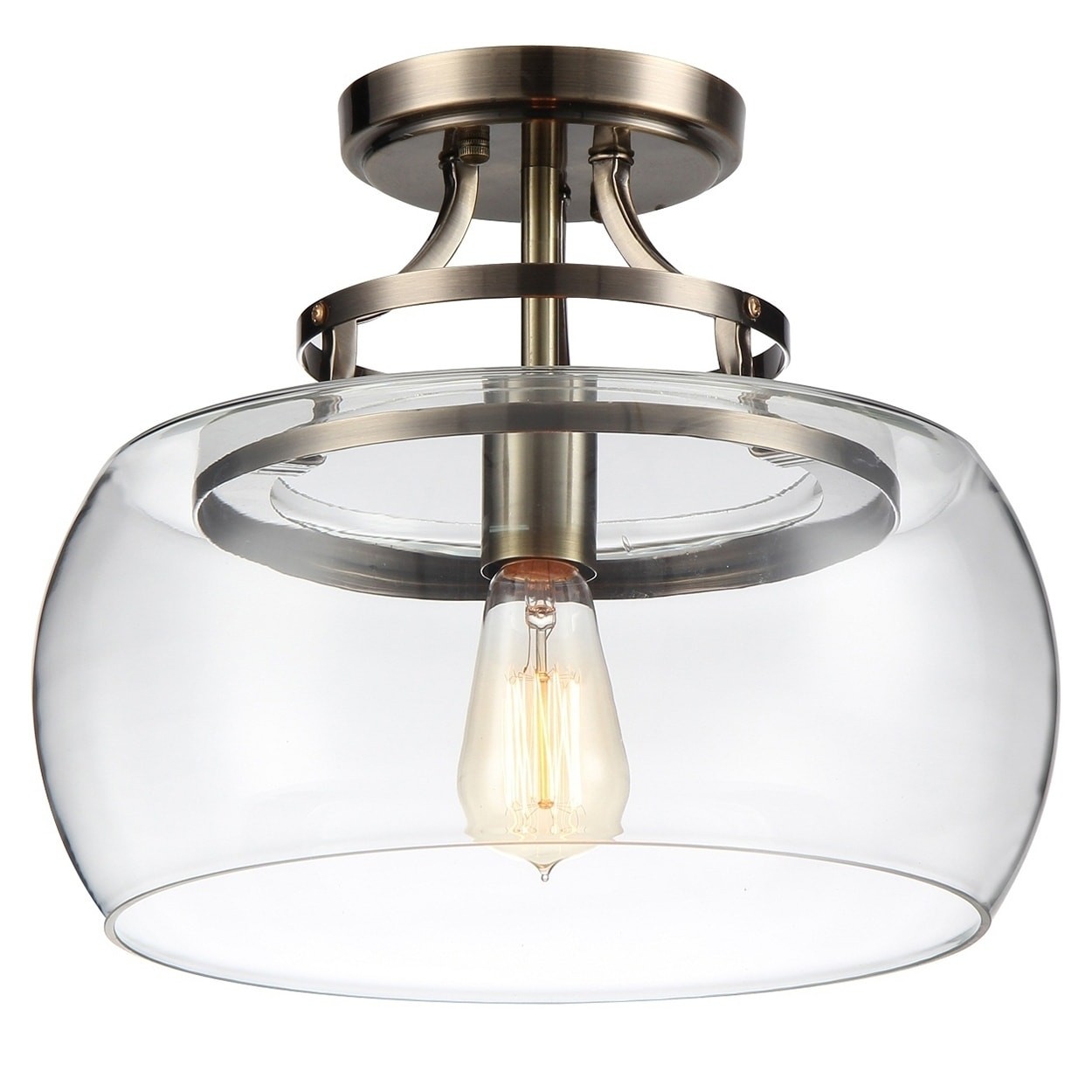 Description:This semi-flush mounted ceiling lamp is a clean and elegant solution to your lighting needs. A full clear rounded glass shade mounts to the lovely brass finished metal fixture. Great for creating a warm illuminated glow with character.Features: Setting: Indoor Materials: Metal, Glass Fixture finish: Brass Shade: Glass Number of lights: One (1) Requires 60-watt E26 light bulb (EDISON BULB INCLUDED) Line switchDimensions: Overall Dimensions: 13.5 inch Diameter x 11.25 inch HeightThis fixture needs to be hardwired. Professional installation is recommended.Assembly Required Free Shipping Over $49.99* Details Kostandea 1-light Bronze 13-inch Glass Flush Mount with Bulb Product Description: Description: This semi-flush mounted ceiling lamp is a clean and elegant solution to your lighting needs. A full clear rounded glass shade mounts to the lovely brass finished metal fixture. Great for creating a warm illuminated glow with character. Features: SettingIndoor MaterialsMetal, Glass Fixture finishBrass ShadeGlass Number of lightsOne (1) Requires 60-watt E26 light bulb ( EDISON BULB INCLUDED ) Line switch Dimensions: Overall Dimensions13.5 inch Diameter x 11.25 inch Height This fixture needs to be hardwired. Professional installation is recommended. Assembly Required