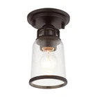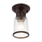 Reminiscent of turn of the 19th century lighting, the Lawrenceville collection highlights a industrial design featuring clear seeded glass and a bronze finish. This single light flush mount fixture easily fits into industrial, transitional and modern classic kitchens, hallways or bathrooms. Beautiful Bronze Finish Suitable for damp locations Requires 1 - 60W MED BASE
