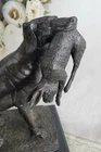 . Condition : This sculpture is in perfect condition. Bronze Dimensions with Marble Base: Height 16" x Width 16" Marble Dimensions:16" X 8" Height without base: 15 " Weight: 28 LBS Inventory: 158556016M51 In this compelling bronze sculpture, the depiction captures a dog, likely a hound, in the midst of a successful hunt, gripping a rabbit firmly in its mouth. The hound's slender form is emphasized, with pronounced ribs and a tail gracefully wrapping around its body as it sits in triumph. The intensity in the hound's gaze, directed upward to the right, conveys satisfaction, suggesting a connection with its owner and a sense of accomplishment in capturing its prey. The snarl on its mouth and the visible grip of its teeth on the limp rabbit by its waist evoke a raw and powerful moment frozen in time. The sculpture emanates a rustic feel, enhanced by a two-toned brown patina, adding depth and texture to the piece. Crafted entirely in bronze, this sculpture is a testament to the skill and artistry of the renowned artist Barye, evident in the lifelike portrayal of this dynamic scene. Antoine Louis Barye, born in France in 1796 and passing away in 1875, left a significant mark on the art world as an Animalier, a sculptor primarily focused on animals, particularly those in the wild. This sculpture exemplifies Barye's mastery in capturing the essence of animal behavior and anatomy. His dedication to the portrayal of animals is evident not only in this piece but also in his extensive body of work, showcasing his talent and expertise. Barye's contributions have earned him recognition, with some of his sculptures exhibited in the prestigious Salon and housed in the Louvre, solidifying his legacy as a highly accomplished sculptor and artist. This bronze masterpiece, signed by Barye, serves as more than a visual representation of a hunting scene; it encapsulates a moment of nature's raw beauty and the interplay between predator and prey. As a part of Barye's extensive portfolio, this sculpture invites viewers to connect with the untamed essence of the animal kingdom, paying homage to the skill and vision of an artist whose work has stood the test of time.