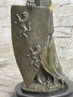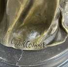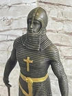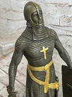 Condition: This sculpture is in perfect condition Bronze Dimensions with Marble Base: Height 15" X Width 6.5" Marble Dimensions: Diameter 6.5" Height without base:14" Weight:11 LBS Inventory:57STE3347BG6775 Introducing the magnificent bronze sculpture of a bold knight, poised to seize his adversary's castle with unwavering determination. Every detail of his full armor has been meticulously crafted with exceptional accuracy, showcasing the artistry and skill of the sculptor. This stunning sculpture features a striking combination of brown and gold patina finishes, enhancing the visual appeal and lending a touch of opulence to the artwork. The intricate textures and meticulous detailing on the knight's armor, from the coif to the breastplate and knee cops, are beautifully highlighted by the patina, adding depth and dimension to the sculpture. Handcrafted using the ancient lost-wax casting method, this sculpture embodies the timeless traditions of bronze artistry. The process ensures that each piece is unique, capturing the essence of the artist's vision and craftsmanship. Mounted upon a sturdy black marble base, the sculpture exudes strength and elegance. It bears the signature of the esteemed artist, J.R Colinet, further enhancing its value and prestige. Embrace the spirit of chivalry and honor with this awe-inspiring knight sculpture, a captivating centerpiece that evokes the grandeur and bravery of medieval legends. Whether displayed in your home, office, or gallery, this remarkable piece of art will command attention and become a cherished symbol of valor and heritage. Bronze Statue of Medieval Middle Ages Knight Jousting Sculpture Figure Figurine Video will open in a new window Using the eBay App? Paste link into a browser window: [isdntekvideo]