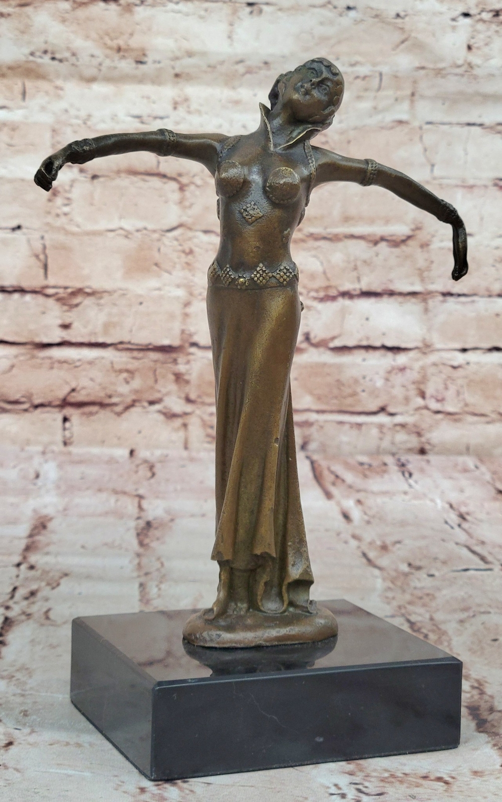Bronze Sculpture Statue Art Deco 9" Tall Dancer Signed Chiparus Figure Gift BB Bronze Sculpture Statue Art Deco 9" Tall Dancer Signed Chiparus Figure Gift BB Condition : This sculpture is in perfect condition Bronze Dimensions with Marble Base: Height 9.5" X Width 7" Marble Dimensions:4" X 4" Height without base:9" Weight:5 LBS Inventory:57Y2382575 The beautiful maiden can be envisioned dancing to a melody only she can hear—an ethereal rhythm known only to her and nature itself. Surrounded by the silent witness of trees, land, and birds, she twirls effortlessly through the open air, a vision of grace and liberation. Her arms are outstretched, her face uplifted, and her spirit seems to soar alongside the breeze as she embraces the sky above. Crafted in bronze, this sculpture captures a fleeting moment of movement and emotion with exceptional detail. The figure exudes a lightness and freedom, her flowing garments and posture reflecting both elegance and spontaneity. Every curve and gesture invites the viewer to imagine the serenity and joy of being truly in harmony with the natural world. Handmade using the ancient lost-wax casting method, this sculpture is finished with a rich brown patina that enhances its depth and timeless character. Mounted on a black marble base for contrast and stability, the piece bears the signature of the renowned artist D.H. Chiparus, ensuring its place as a collectible and cherished work of art. 100% Solid Bronze Egyptian Sculpture Signed Art D.H. Chiparus Figurine Decor Video will open in a new window Using the eBay App? Paste link into a browser window: [isdntekvideo] Shipping Terms : Most of our items are shipped via USPS (United States Postal Service) mail or UPS. Most orders are shipped within 24-48 hours of purchase. Please be aware that not all items are available for USPS shipping due to size and weight. We do ship to Hawaii, Alaska, Canada, Puerto Rico, APO/AE, and U.S. Virgin Islands, however, an additional charge may be required. Please contact us before making any purchases in these areas. For Non-USA customers, you may be responsible for all duty, tax, brokerage fees that may be due upon delivery (shipping costs cover freight charges only). We also ship internationally. Please refer to the "Shipping and Handling" chart for the rates for each area. Payment : We accept just about any form of payment. PayPal, Master Card, Visa or American Express credit cards. Money orders, cashiers checks, and even personal or business checks. For governmental institutions, we will also accept a purchase order. Please understand that for personal or business checks we have to wait for the check to clear (usually 7 days) before shipping. Condition : New Detailed Hand Crafted Hot Cast Bronze Satisfaction Guaranteed. This is Stock Photo, Slight Color Variation!! Listing and template services provided by inkFrog