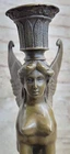 Condition :nbsp; This sculpture is in a perfect condition. Bronze Dimensions with Marble Base: Height 9" X Width 4" Marble Dimensions:4" X 3" Height without base:8" Weight:5 LBS Inventory: 67CH0034656 This exquisite candle holder features the Sphinx, a legendary creature from Greek mythology known for her riddles and deadly embrace. Depicted with the body of a lion and the head of a woman, the Sphinx is captured in stunning detail in this bronze sculpture. Her golden bronze skin and long hair tresses add to her allure and the dark brown and gold patina finish gives the piece a timeless quality. As a nod to the Greek origin of the Sphinx, this sculpture is created using the ancient lost-wax casting method, which was first developed in Greece over 2500 years ago. The name "Sphinx" comes from the Greek word "sphiggo," meaning "to strangle," referencing the Sphinx's reputation for killing those who could not solve her riddles. This handcrafted candle holder rests on a unique pedestal, with the Sphinx's body forming the feet of the base. The piece is signed by the artist Milo, ensuring its authenticity and adding to its value as a stunning work of art. Nude Female Sphinx Candle Holder Candelabra Bronze Statue Sculpture Figure CH-OO3 Video will open in a new window Using the eBay App? Paste link into a browser window: [isdntekvideo]