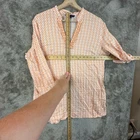 Brook Brothers 346 Diamond Print Cotton Boho Tunic Top Popover Peach Orange White XL Excellent condition, no flaws or major wear. Size XL, approx measurements in photos. Pullover Style Neck with Solid Trim at Neckline Mandarin Collar 3/4 Sleeves Slit at the Hem 100% Cotton Machine Wash Made in India Approximate Measurement: Pit to Pit: 22" Length: 28.5"