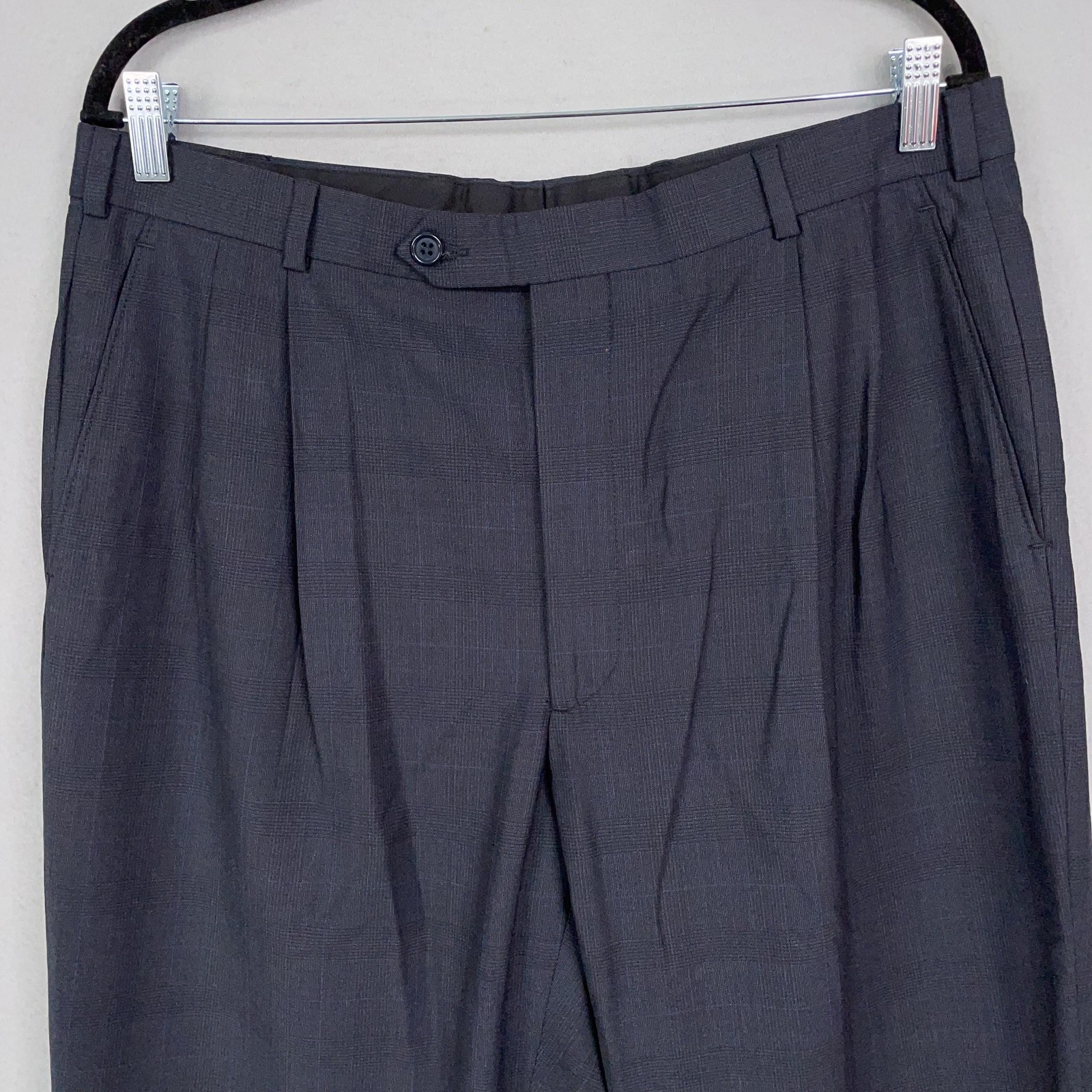 Gently worn with light wrinkling from storage; no holes or stains observed. Buttons and zipper work properly; cuffs and seams intact. Brand: Brooks Brothers (346 line) Stretch Item: Mens dress pants/trousers in a dark charcoal gray with a subtle micro-check pattern. Materials (per tag): 97% wool, 3% lycra; dry clean only. Made in Jordan. Design details: Pleated front, cuffed hems, zip fly with extended button-tab closure, belt loops, slant front pockets, buttoned rear welt pockets. Notes: Size tag not visible in photos. measures 34x30 approx . Classic tailored look with light stretch for comfort. 22429 Measurements: - Previous washings may change the sizing written on the tag. - Please refer to the photos above for all measurements. - Please compare our measurements to that of one of your favorite garments. - Please note, item measurements are approximate . All items are bagged and sealed after being photographed, then stored in a smoke free environment to ensure the item is exactly the same as when photographed. All items have been washed per eBay standards & policies. I carefully package and ship daily. Feel free to contact me with any questions.