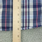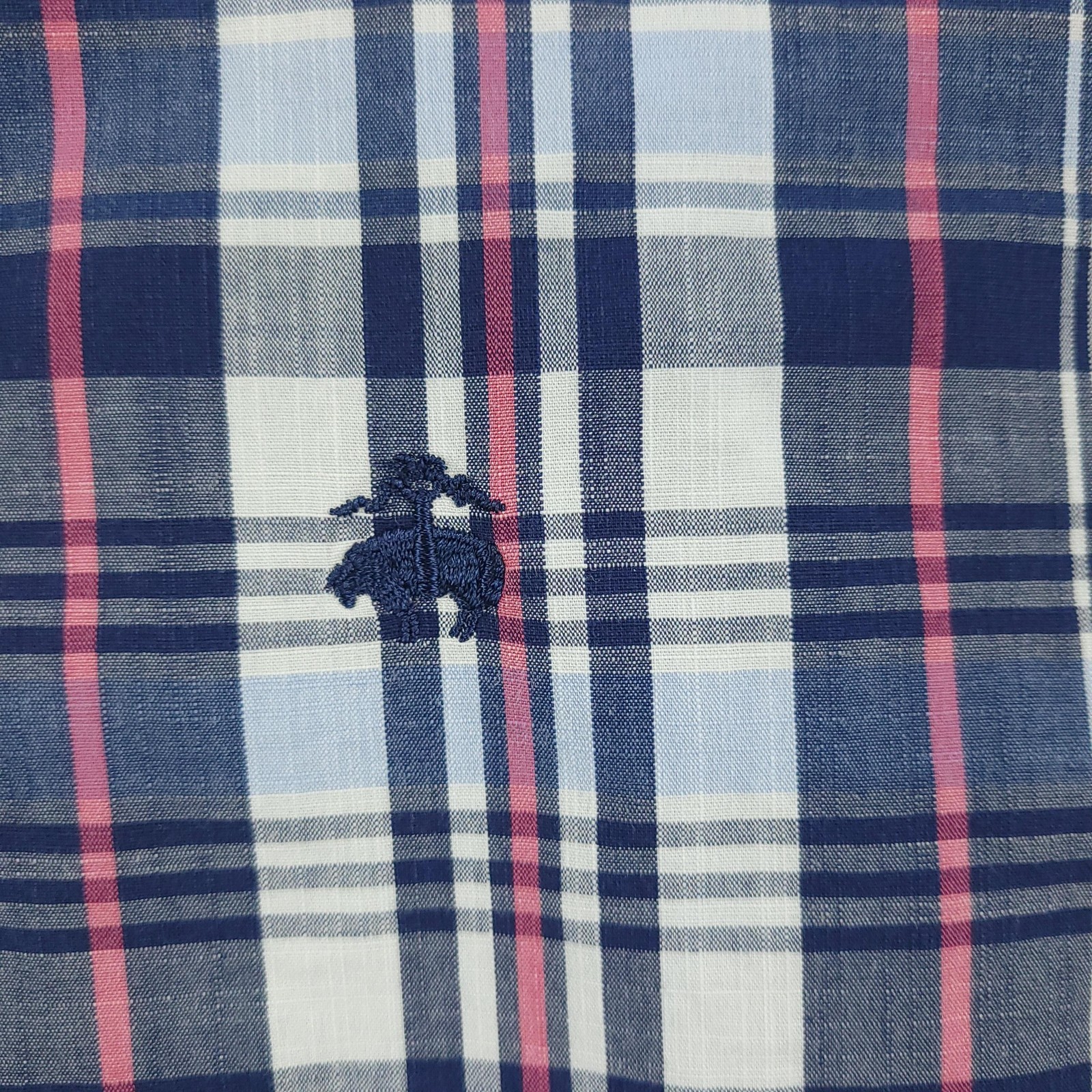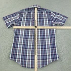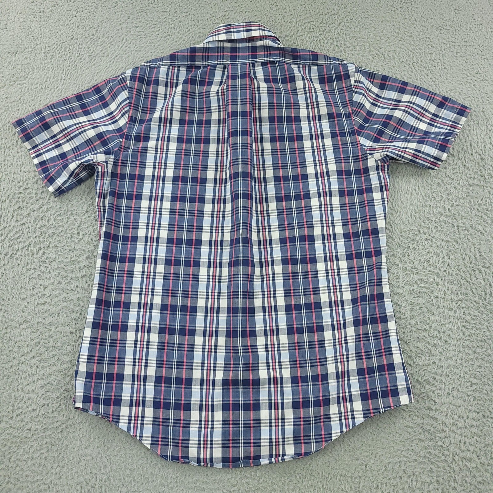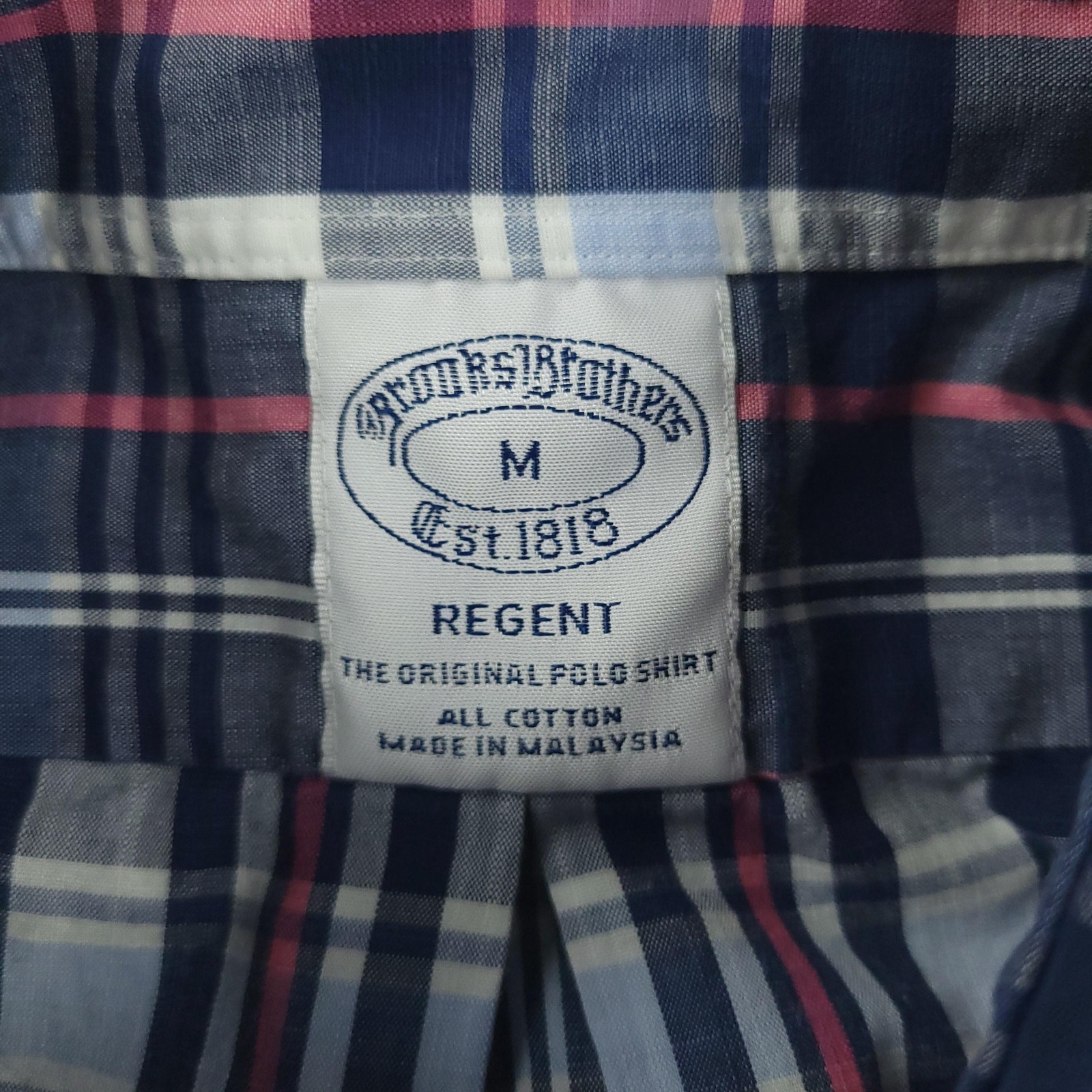 Brand: Brooks Brothers Style: Mens short-sleeve button front shirt in the Regent fit with button-down collar. Pattern: Blue, navy, white, and pink plaid with embroidered Brooks Brothers logo on chest. Material: 100% cotton (per tag). Color: Multicolor plaid dominated by blue and pink tones. Size on tag: Mens Medium. Details: Button-down collar, front button closure, curved hem, lightweight woven fabric, embroidered logo. Made in Malaysia; inner label reads "The Original Polo Shirt". Washed and dried with Fragrance Free Detergent & Dryer Sheets. Measurements are included in the photos, compare measurements with your item to ensure proper fit. (Measurements are done with the item lying flat). I ship next business day and all items include tracking. Items are added daily to my store
