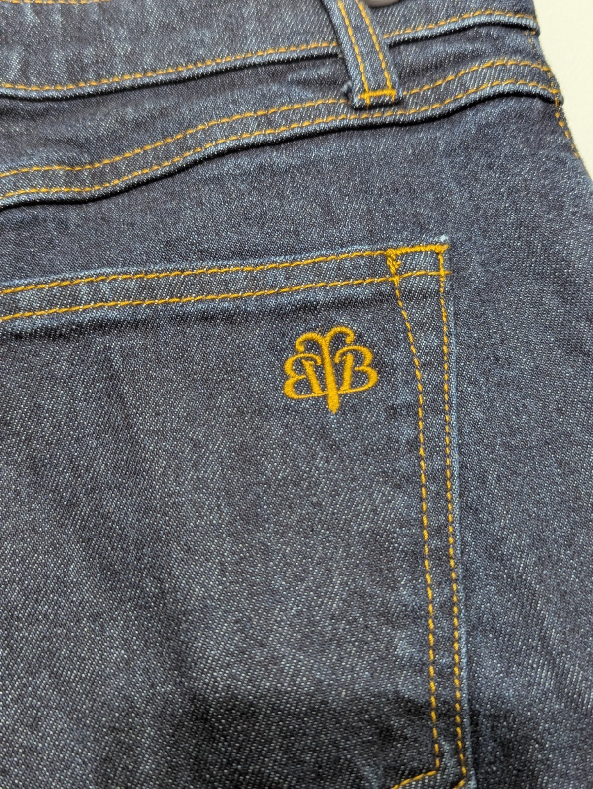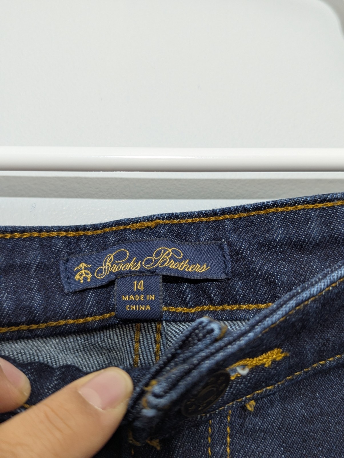 The product is a pair of Brooks Brothers Slim Straight Leg 5 Pocket Denim Jeans in a dark wash with the brand's logo embroidered on them. These women's jeans are in size 10 and feature a high rise, making them a flattering fit for a slim figure. They are made of a blend of spandex, cotton, and cotton denim fabric, and are machine washable for easy care. The jeans have a classic 5-pocket design and straight leg style, perfect for a city, 90s, or preppy themed look.