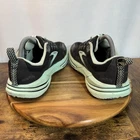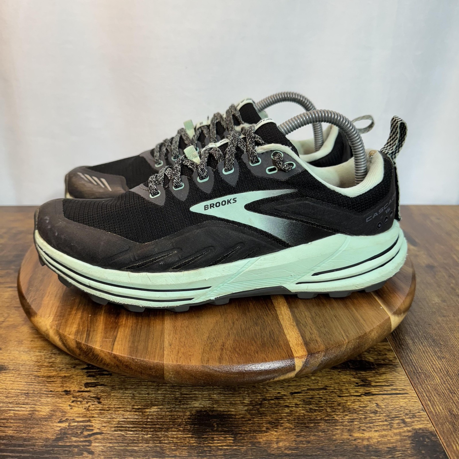 Brand: Brooks Model: Cascadia 16 trail running shoes designed for off-road and mixed-terrain running. Color: Black uppers with mint green midsole and accents, black and white patterned laces and pull tabs. Gender: Womens Size: Womens US 9.5, UK 7.5, EU 41, 26.5 cm; width Medium (B). Style/Model code on tag: 1203631B049; additional code: 8469. Production date on tag: 05/21. Barcode number on inner tag: 90340972881. Features: Breathable mesh uppers with synthetic overlays, lace-up closure, cushioned midsoles, lugged rubber outsoles for trail traction, pull tabs at heels, "Explore Any Trail" branding on heel area.