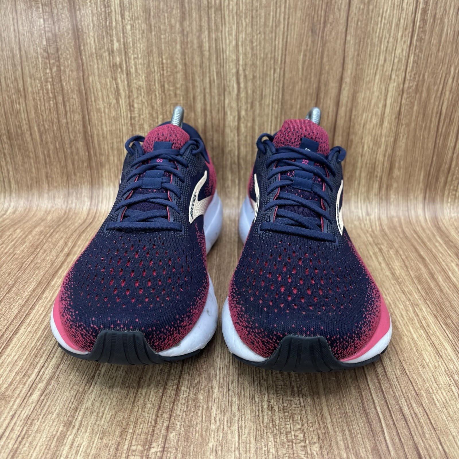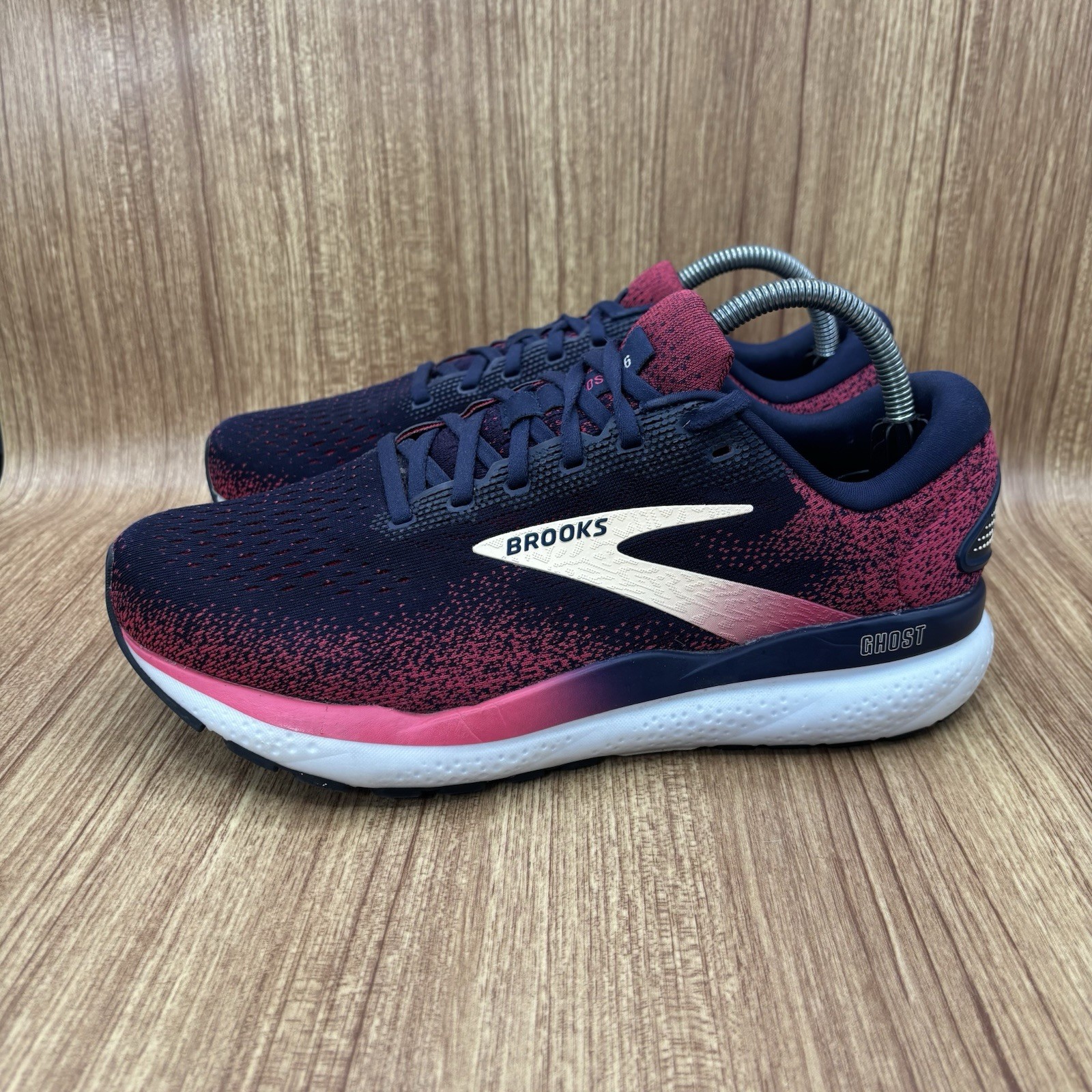 Brooks Ghost 16, Peacoat/Raspberry/Apricot Women's size 10.5 2E Extra Wide US Preowned Has signs of wear. See all photos. One shoe shows fabric tear in back. Priced with this in mind. Insoles have been replaced for new insoles.