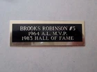THIS AUCTION IS FOR THE NAMEPLATE ONLY !!!!!!! BOBBY'S HANG-UPS PREMIUM QUALITY ACRYLIC DISPLAY CASES AND CUSTOM ENGRAVED NAMEPLATES SINCE 1999 THESE NAMEPLATES ARE GREAT FOR DISPLAY CASES, FRAMED AND MATTED PHOTOS AND JERSEYS, SHADOW BOXES, PLAQUES, ETC. WE SPECIALIZE IN CUSTOM ORDERS OF ALL NAMEPLATES. WHETHER IT'S FOOTBALL, BASEBALL, BASKETBALL, HOCKEY, GOLF, BOXING OR ANY PERSONALIZED NAMEPLATE THAT YOU MAY NEED. WE CAN MAKE JUST ABOUT ANY NAMEPLATE THAT YOU ARE LOOKING FOR. PLEASE LIMIT THE AMOUNT OF TEXT TO 3 LINES ON THIS SIZE NAMEPLATE. OUR NAMEPLATES ARE TRIPLE ENGRAVED TO GUARANTEE CRISP, READABLE TEXT. NAMEPLATES ARE HAND POLISHED BEFORE SHIPPED TO MAKE SURE THE ENGRAVING REALLY STANDS OUT. ALL NAMEPLATES HAVE HIGH QUALITY DOUBLE SIDED TAPE TO ENSURE IT WILL STAY IN PLACE. CLICK HERE AND GO VISIT OUR EBAY STORE FOR MORE GREAT ACRYLIC DISPLAY CASES AND ENGRAVED NAMEPLATES !!!! PLEASE CHECK OUT OUR EBAY STORE, AND CHECK OUT ALL OF OUR ACRYLIC DISPLAY CASES AND NAMEPLATES. IF YOU DON'T SEE THE NAMEPLATE YOU ARE LOOKING FOR OR IF YOU ARE LOOKING TO PLACE A CUSTOM ORDER, PLEASE FEEL FREE TO EMAIL US AND WE WILL GET WORKING ON YOUR ORDER RIGHT AWAY. THANK YOU! THIS PURCHASE IS FOR A BROOKS ROBINSON NAMEPLATE. IT IS BLACK ON BRASS BACKED ON POLISHED GOLD PLATING. THE NAMEPLATE MEASURES APPROX 1"x 3" IN TOTAL WITH ENGRAVED TEXT THAT READS: BROOKS ROBINSON #5 1964 A.L. M.V.P. 1983 HALL OF FAME IF YOU ARE PURCHASING DIFFERENT TEAM OR PLAYER NAMEPLATES, AND DIFFERENT SIZES AT THE SAME TIME, PLEASE USE THE SHOPPING CART FEATURE AND PLEASE REQUEST A TOTAL BEFORE MAKING PAYMENT TO ENSURE YOU GET THE PROPER COMBINED SHIPPING DISCOUNT. Be sure to add me to your favorites list ! DON'T FORGE T TO LIKE, FOLLOW AND SHARE US ON FACEBOOK TO GET NEWS ON ALL OF OUR NEW RELEASES https://www.facebook.com/bobbyshangups