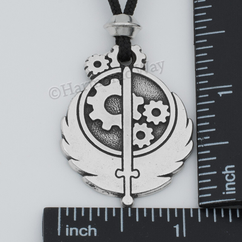 Brotherhood of Steel Necklace Courage today-Victory Tomorrow Within the saga of Fallout, the keystone of humanity's survival is a remnant of an Armed Forces detachment that survived the Nuclear Holocaust of 2077 . Known as the B rotherhood of Steel, its military origins began on January 3, 2076. The brotherhood was a specialized unit that was created as a joint operation of the United States Armed Forces and a secret government scientific research department. On October 23, 2077 the great war between the United States and China began, it lasted only 2 hours and reduced the world into a vast Radioactive Wasteland. By the grace of fortune, a detachment of the Brotherhood survived the carnage. Days after the onslaught, the remaining unit forged its way through the devastation, eventually finding sanctuary in a government fallout shelter called "Lost Hills". Almost no information survives in regards to the Brotherhood of Steel until the year 2134, when the surviving outpost began its quest to collect pre-war technology. In the Brotherhood Symbolism the gears represent their Engineering Knowledge. The Sword is their will to defend themselves. The Wings represent the uplifting hope that the acquisition of lost technology will bring Mankind's Salvation following the Great War. Lastly, The Circle symbolizes the fraternal unity that makes the organization a true Brother Hood. This piece is Superbly hand-crafted in the highest quality lead-free Pewter available. A unique finishing process is used resulting in one of the most beautiful lines of jewelry you can find! This pendant is brand new, detailed on both sides and comes with a 36" black cord with accent bead. Talisman are Sold for novelty only, no Magical Properties implied.