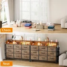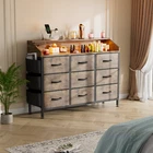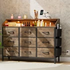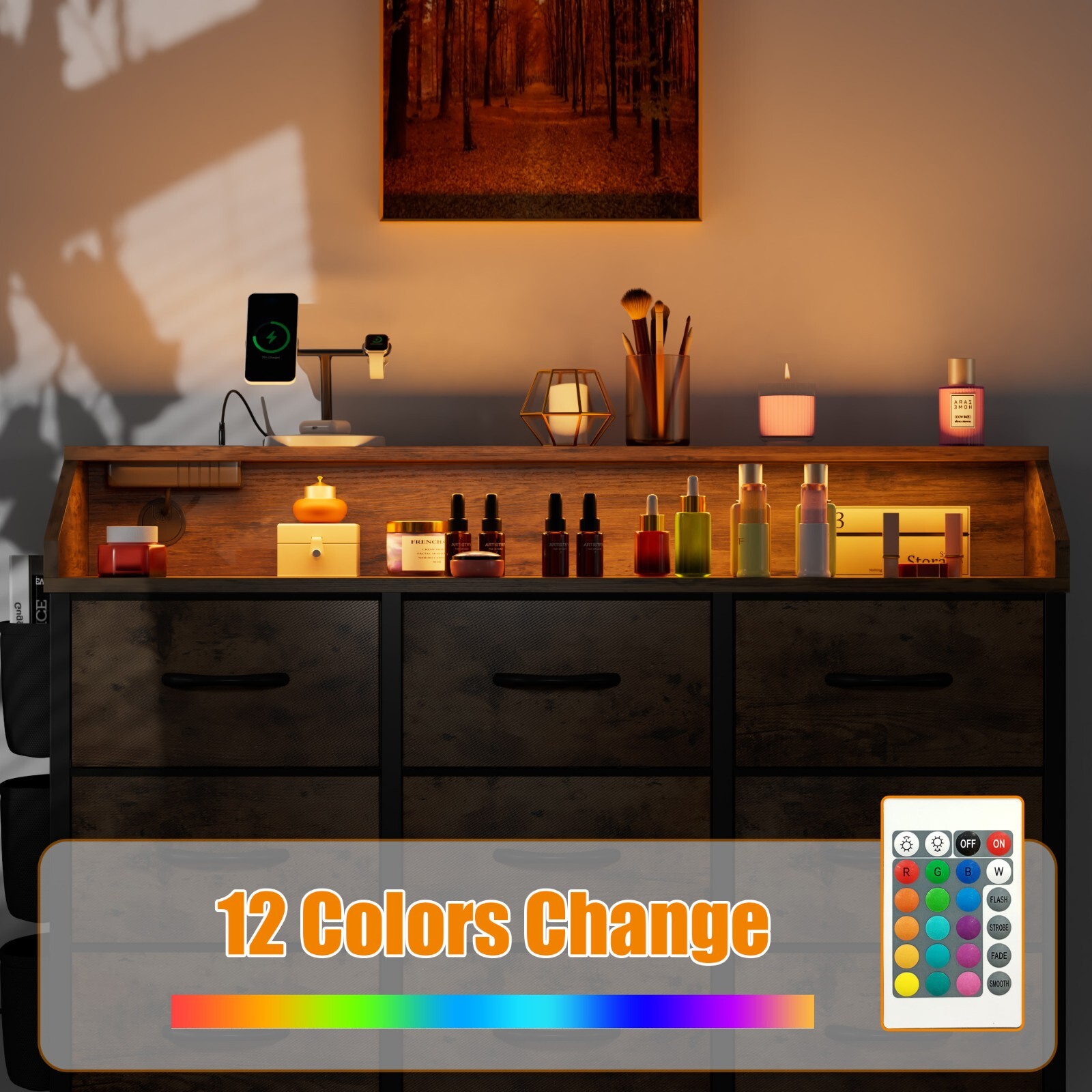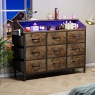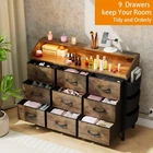 Features: 【Dresser with RGB LED Lights】LED lights make the drawer dresser look prettier in the dark and add a unique vibe to your bedroom. The LED lights can be controlled by button control or APP. It has more than 21 colors to choose from, the brightness can be adjusted, and many other modes are waiting for you to explore: custom style mode, music mode, mic mode, and timing function. 【Charging Station and USB Port】Drawer Dresser is equipped with 2 standard plug outlets and 2 USB ports, as well as a 4.92-foot-long power cord. It enables you to charge mobile devices such as phones, keyboards, headsets, desk lamps, and other appliances anytime. Easy to use within your arms' reach. 【Storage to Get Rid of Clutter】LED leather with fabric drawer dresser has 9 spacious private storage drawers, which can store your clothes, toys, books, or any other personal items. The top layer open storage shelf and large desktop can be used to display or store your frames, vases, books, or other decorations. Making it easier for you to sort and store clutter! Overall measures 11.8"D x 43"W x 32.7"H. 【Steady Quality Assurance】Wide 9 drawer chest is constructed of a solid MDF wood top, which has a strong load-bearing capacity and is sturdy and durable. Each drawer is fitted with smooth metal slide rails that are easy to pull out. The thick back plate and the anti-fall device ensure the privacy and stability of the drawer dresser. 【Let Us Know】Assemble is required, but don't worry! Drawer dresser has clear Installation steps, and all parts are individually packed and marked. If you have any problems with assembly and quality, please contact our store's support team first and we’ll give you a solution. Thank you for your support and trust! Specifications: Material: Metal Frame, Fabric Drawers, Wood Top Drawer Type: Fabric Drawers Product Dimensions: 43 x 11.8 x 32.7 in Product Weight: 32 lb Package Dimensions: 46 x 14 x 7 in Package Weight: 37 lb Top Board Weight Capacity: 100 lb Product Care Instructions: Wipe with Dry Cloth Assembly Required: Yes Package includes: 1 x 9-drawer Dresser 1 x All Assembly Tools 1 x Installation Manual