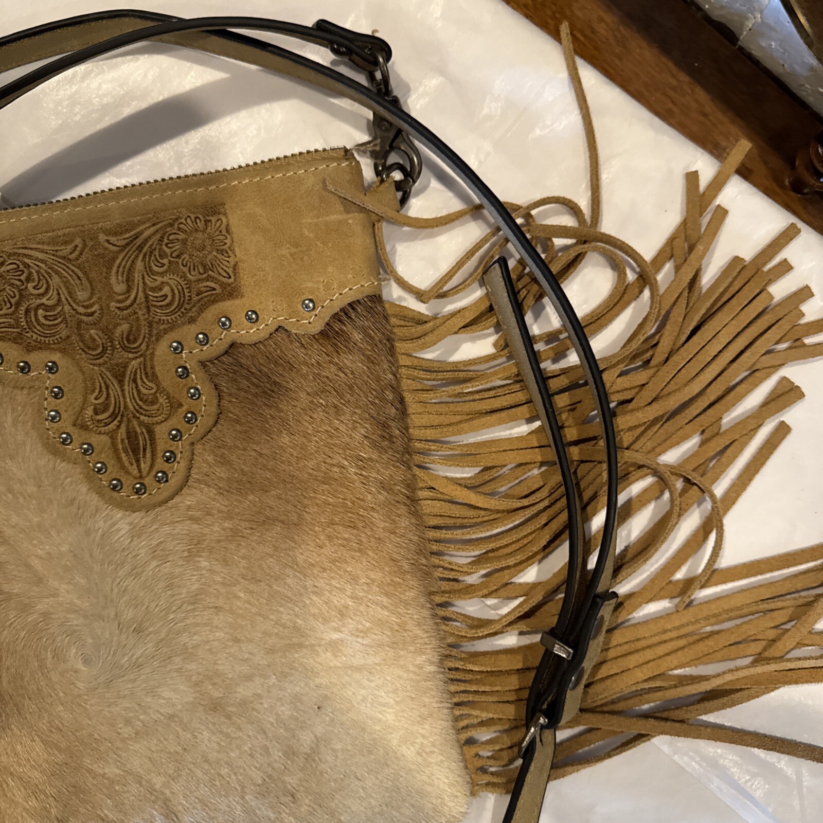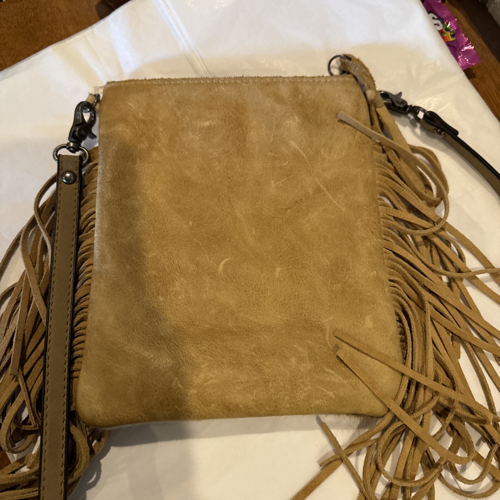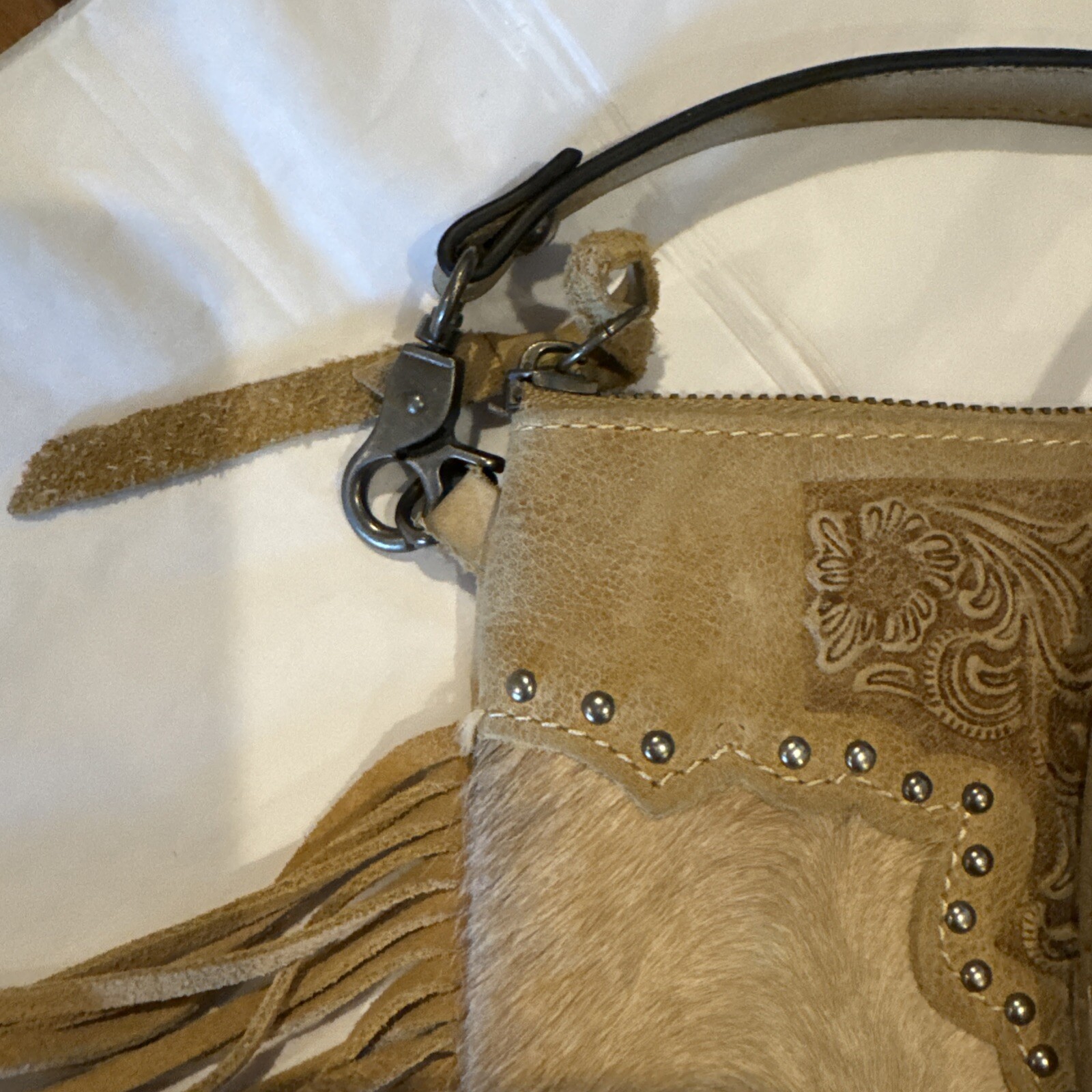 This is a stylish brown leather small purse designed for women. The purse features fringes and studs for a trendy look. It has a rectangular shape with a zip closure, making it convenient to access your belongings. The purse has brown handles/straps and a matching brown lining, complementing the exterior color. With a crossbody style, this purse is practical for on-the-go use and adds a touch of edgy sophistication to any outfit.