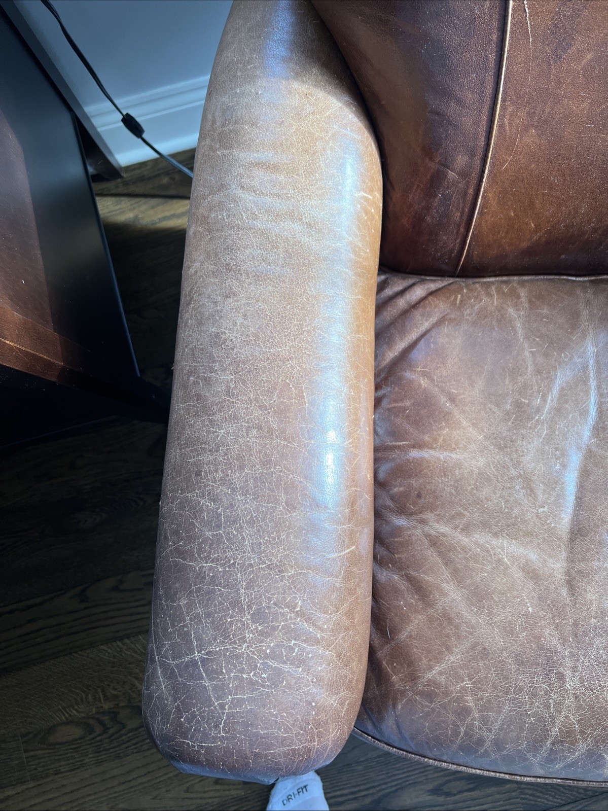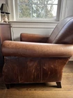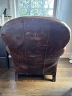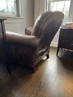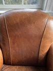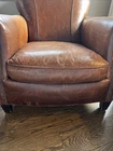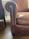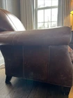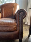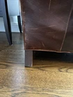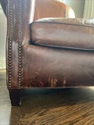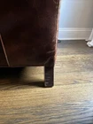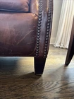 The Crate and Barrel Trevor Brown Leather Chair is a stylish and elegant accent chair perfect for adults. With its dark wood oak frame and brown leather upholstery, this chair adds a touch of sophistication to any room. The nailhead detail gives it a unique and luxurious look, making it a versatile piece that can be placed in the living room, bedroom, entryway, or home office/study. Fully assembled and requiring no additional assembly, this chair is a comfortable and timeless addition to any indoor space.