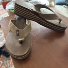 Experience classic comfort and style with these Rainbow women's leather thong sandals. Designed with a sleek brown hue, these flip flops feature a 2.25” platform wedge heel that adds just the right amount of height, making them perfect for all-day wear. The sandals are crafted with a high-quality leather upper and lining, ensuring durability and a soft feel with every step. The slip-on design allows for easy wear, while the rubber outsole provides a sturdy grip on various surfaces. With a standard shoe width and a US size 10, these sandals are a versatile addition to any wardrobe. The timeless thong model, accented with the brand's signature logo, offers a preppy and college-inspired theme that pairs effortlessly with a rainbow of outfits. They were worn once as can be seen by the soles, they were too big and missed the return window.