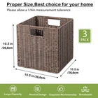 BUILT-IN HANDLES:Our 10.5 in cube wicker baskets with cut out handles which makes these baskets easy to carry from room to room, and its collapsible design makes them easy to store when not in use Material:Handwoven with plastic material, durable and strong bearing capacity.We recommend storing baskets when not in use, they fold for easy storage Size:10.5"L x 10.5"W x 10.5"H, suitable for kallax cabinets with an inner diameter of 10.75 inches or more. (Please know the size of the basket before purchasing to avoid that do not match your shelves and cause you the trouble of returns.) Multipurpose Use:These wicker storage bins are brilliant for storage under tables, or as drawers for square shelves & Kallax. They can store many household items, such as food & snacks in your kitchen, or pillows and clothes in the bedroom. Please Note:please allow a 1/4" measurement tolerance; Suitable for indoor or outdoor use .