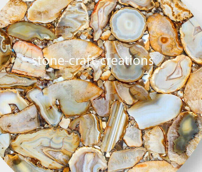 Welcome To Stone-Craft- Creations Shop Description Very unique Art by Indian Artist ,Coffee/Side Table top Used Material: Natural Agate Stones Arts Size: According to Size Variation Color: As Photo Shape: Round Pattern: Handmade Room: Bedroom, Dining Room, Hallway, Home Office/Study, Kid’s Bedroom, Kitchen, Laundry/Utility Room, Living Room,Patio, Playroom Packaging: Wood & Foam Export Packing Shipping: Air Can Be customize ,Please Message us your desired Size 1. It can be used as a Dining Table, Guest table, coffee table, center table top in show room as well as a gift for your loved ones. 2. The table top is made in Agra India & fully handmade. 3. The top will be delivered by FedEx or DHL free of cost door to door. 4. If there is any local tax,custom duties or Vat will be paid by the buyer at the destination. 5. The parcel is dispatch with proper packing & fully insured covering all kind of risk. 6. To maintain the table top is simple soap & water & dry cotton cloth. 7. If You Are Looking Something Customize, Let Us Know We Will Make For You As Per Your Design, Size & Shape. 8.Table top does not includes any wooden, marble stand or base if you like to buy marble or wooden base or stand that will be charged extra. Marble Agate Table Tops We are Manufacturer & Exporter of marble agate table tops. These marble agate table tops have different shapes like Round Table top, Octagonal Table Tops, Rectangle / Dining table tops, Square Table tops, Chess Table tops, Taj Mahal Table tops, Custom Designs Table tops also make marble Table top Base and Stand. Then we can be used as dining tables, coffee tables, Center tables, conference tables, chess boards, reading tables, bar tables , Garden table, side and corner tables or any other use as per the indoor and outdoor decor. They can also be placed outdoors in the garden, as marble is stain free, offers great resistance to the forces of nature, and can withstand heavy temperatures. We also meet customized requirement and offer our marble table tops at industry leading prices. About Agate Stone- Agate is a rock consisting primarily of cryptocrystalline silica, chiefly chalcedony, alternating with microgranular quartz. It is characterized by its fineness of grain and variety of color. Although agates may be found in various kinds of host rock, they are classically associated with volcanic rocks and can be common in certain metamorphic rocks. Ancient use of agate stone Agate is one of the most common materials used in the art of hardstone carving, and has been recovered at a number of ancient sites, indicating its widespread use in the ancient world; for example, archaeological recovery at the Knossos site on Crete illustrates its role in Bronze Age Minoan culture Types Of Agate 1. Fortification Agate This is the most common and distinctive type of agate. In these agates, bands crystallized into concentric layers that more or less follow the shape of the cavity. The banding resembles an aerial view of a fort 2. Water-Line Agate (also called water-level or onyx) During its formation, silica-rich solution either entered the cavity slowly laying one band at a time, excess water drained out leaving a small amount of silica to settle out into separate bands, or the vesicle filled under low pressure. In any case, the silica crystallization in water-level agates is controlled by gravity in one orientation, forming a stack up of parallel bands. 3. Shadow Agate Some agates exhibit a shadow effect in which there is what appears to be movement across the agate layers when the specimen is rocked back and forth (or your orientation to the specimen moves). This optical effect only occurs when there are alternating translucent and opaque bands. It is caused when light goes into the agate, but is not reflected out. 4. Tube Agate Tube Agate During the formation of some agates, parallel projections of tiny hair-thin mineral rods grow first within the silica gel, around which later the chalcedony agate micro-crystals form. In some cases the inclusions remain, but sometimes they weather away leaving hollow tubes that subsequently fill in with silica. 5. Eye Agates This mysterious agate characteristic is believed to be formed when most of the silica gel drains from the cavity, leaving only a droplet that “beads up” on the inside wall of the cavity. This droplet crystallizes into solid chalcedony “eyes”. In some cases, crystal growth will continue from this droplet in a manner similar to the formation of stalactites in caves. Later, the pocket fills in with the usual deposition of chalcedony microcrystals. 6. Plume Agate These agates initially had formations on their outside layer that formed prior to the deposition of chalcedony bands. They are filament growths of mineral inclusions that resemble ferns or feathers. 7. Geode Agate Geode Agate In some cases the supply of silica-rich water runs out before the entire cavity fills in. When there is a hollow center within a crystalline outer fill, the specimen is considered a geode. Not all geodes have agate banding, but many do. Also, the inner layers can form into several different types of silica mineral crystals and may even have other types of mineral crystals. 8. Moss Agate Moss Agate Moss agates have clusters of mineral inclusions that resemble plants, trees, or landscapes. Most moss agate inclusions are comprised of iron or manganese oxide. In some cases, the inclusions inhibit chalcedony banding allowing the mineral clusters free reign to grow within the silica gel. 9. Seam Agate Seam agates for in cracks within host rock, rather than in rounder pockets. The bands form in parallel rows that follow and fill in the crack or seam.