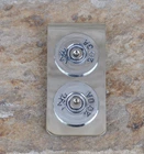 Browning 20 gauge Double Shotgun Shell Nickel Silver Money Clip. Measures 2" x 1" wide. The Money Clip is brand new. We added two shotgun shell bullet rim. Highly Polished. Their is no powder or active primer in this shell casing. Made in the USA. Comes with a gift box.