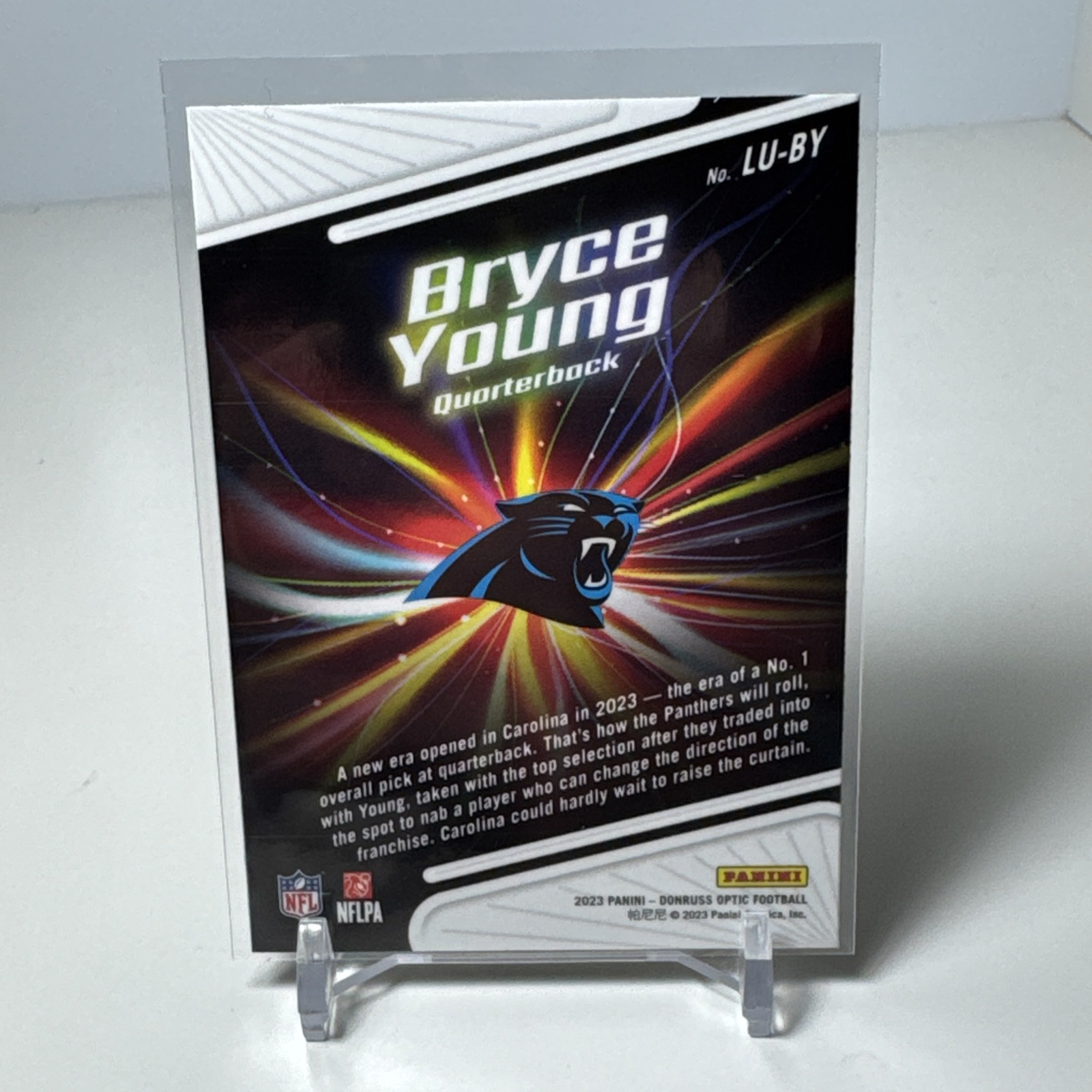 Elevate your football card collection with the BRYCE YOUNG 2023 DONRUSS OPTIC LIGHT IT UP ROOKIE PANTHERS RC Q0234. This sports trading card captures the essence of the promising athlete in vibrant, eye-catching detail. As a part of the DONRUSS OPTIC LIGHT IT UP ROOKIE PANTHERS set, it's a must-have for fans and collectors alike, featuring a standout design that celebrates Young's rookie season. Crafted with care, the card measures a standard 3½" x 2½" and is an original piece, not a reprint. It's a valuable addition for those who appreciate the art of collecting or the sport of football, capturing the spirit of the game and the potential of player Bryce Young. Whether for display or as a treasured keepsake, this card is a noteworthy acquisition for any collection.