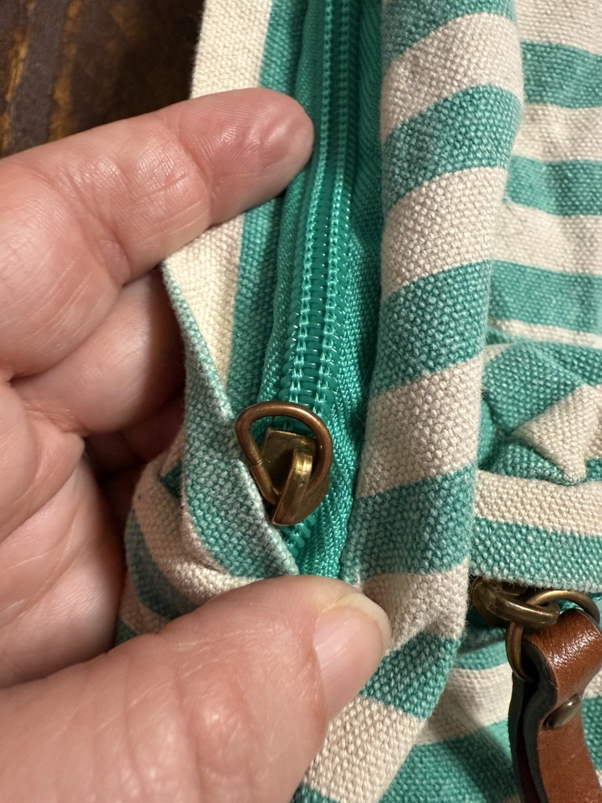 Bueno back pack green and white stripes 3rd pic shows the zipper lost it string but still works