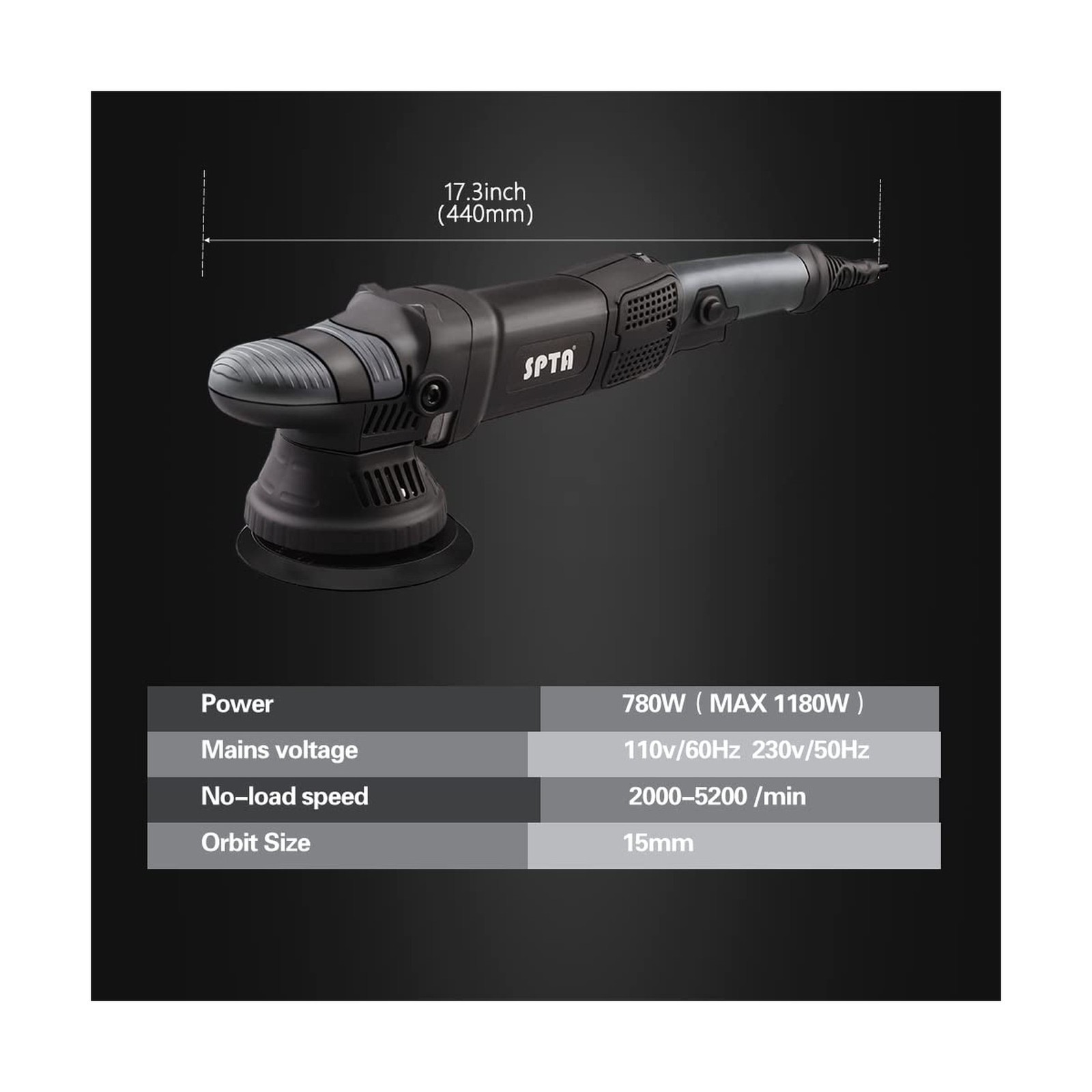 Buffer Polisher, SPTA 5-Inch 125mm Dual Action Random Orbital Car Polisher,Car Detailing Kit, 4Pcs 5inch & 4Pcs 6Inch Polishing Pad,Packing Bag for Car Polishing and Waxing--DAPSET-US Description Features: EXCELLENT PERFORMANCE - The SPTA DAPSET-US is a 110V 6.5A dual-action polisher. With powerful motor, this random orbital polisher is perfect for polishing and removing swirls, scratches, and defects from all painted vehicles, reappearing the shine of your car. You can also use it to sand wood or metal,POWERFUL POLISHER - Eccentric polisher with 750W power, light body, easy replacement of carbon brushes. Constant power and constant speed function, more stable. VARIABLE SPEED CONTROL - 6-speed control dial allows you to adjust the car polisher speed according to different applications; No load speed: 2,000-5,200/MIN; Low speed for waxing and buffing; Medium speed for polishing and cleaning while high speed for removing paint defects and oxidation. CONSTANT POWER AND SMOOTH START - The speed can be maintained by high quality electronics, which makes this buffer polisher is easy to use and comfortable, convenient for long time work and reducing fatigue DETACHABLE HANDLE - Ergonomic design, comes with a side handle and a D-handle, you can choose the way that makes you feel comfortable, safe & provides convenient operation.MULTIPLE USES - With 6 adjustable speeds to meet your different work needs, it can be widely used in cars, motorcycles, furniture, floors, etc. PRACTICAL ACCESSORIES - With 1x 120ML Coarse Compound,1x 120ML Fine Compound, 1x Wash dish brush, 1x Large size kit, 1xApron,1x5"backing plate, 1x Handle, 2x Carbon brush, 2x Wrench, 1x D type handle, 2x Hex screw, 1xManual, 3x 5"6"Sponge Pad, 1x 5"6"Wool Pad, 1x Yellow Glove, 2x Towel,12x5"Sanding Discs Sandpaper,12x6" Sanding Discs Sandpaper Product Details: Brand: SPTA Included Components: Bag Material: Plastic Color: Multicolor Power Source: Corded Electric Specific Uses For Product: Finish Cutting Amperage: 6.5 Amps Voltage: 110 Volts Maximum Power: 7.5E+2 Watts Global Trade Identification Number: 44 Manufacturer: SPTA Model: DAPSET-US Item Weight: 12.23 pounds Package Dimensions: 20 x 8.5 x 8 inches Item model number: DAPSET-US Manufacturer Part Number: DAPSET-US Special Features: Easy to Install Wattage: 750 watts Date First Available: June 3, 2020 Delivery We Do Not Ship Outside of the Continental US. Return Policy All items qualify for returns within 30 days of receipt. Seller is responsible for return shipping on any item that is not damaged. Feedback We take our reputation seriously, we buy and sell online, so we understand the value of trust. If you are unsatisfied with your order, please contact us and we will work with you to resolve it to your satisfaction.