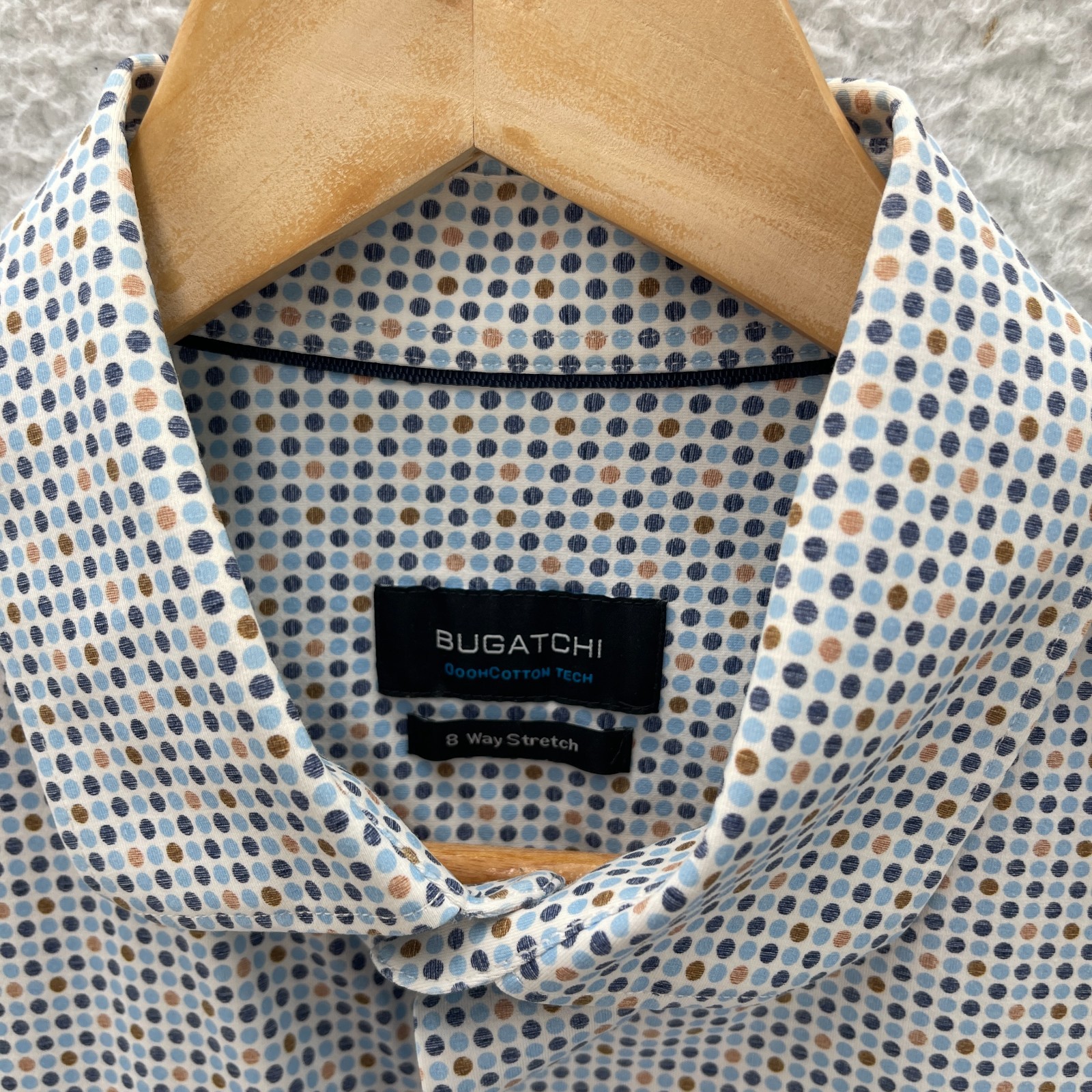 Bugatchi Shirt Mens M Blue OoohCotton Tech 8 Way Stretch Button Up Short Sleeve Sizing in the title and item specifics are based on what the tag says. Measurements can be seen in the photos.