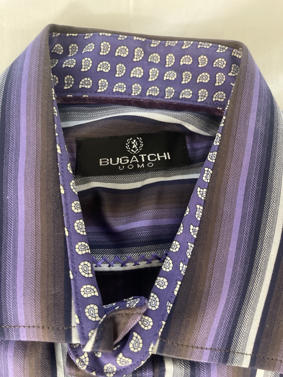 The Bugatchi Uomo Men's Long Sleeve Button-Up Shirt in Purple Stripe is a stylish and versatile addition to any man's wardrobe. Made from high-quality cotton fabric, this shirt features a classic collared neckline with a contrasting trim accent, giving it a modern and sophisticated look. Perfect for casual occasions, the shirt also includes a convenient pocket detail and a regular fit for comfort. Ideal for the winter, fall, or spring seasons, this shirt is easy to care for with hand wash instructions. Perfect for those looking for a classic yet trendy button-up option.