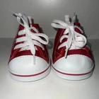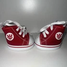 This Build-A-Bear Workshop item is a pair of red and white high-top sneakers made of cloth and rubber. The shoes have a lace-up design and are suitable for everyday wear. They are unboxed and lightweight, perfect for dressing up a bear in activewear or casual clothing. These shoes are part of the Build-A-Bear franchise and are original to the brand, specifically designed for bears to wear as a fun and stylish accessory.