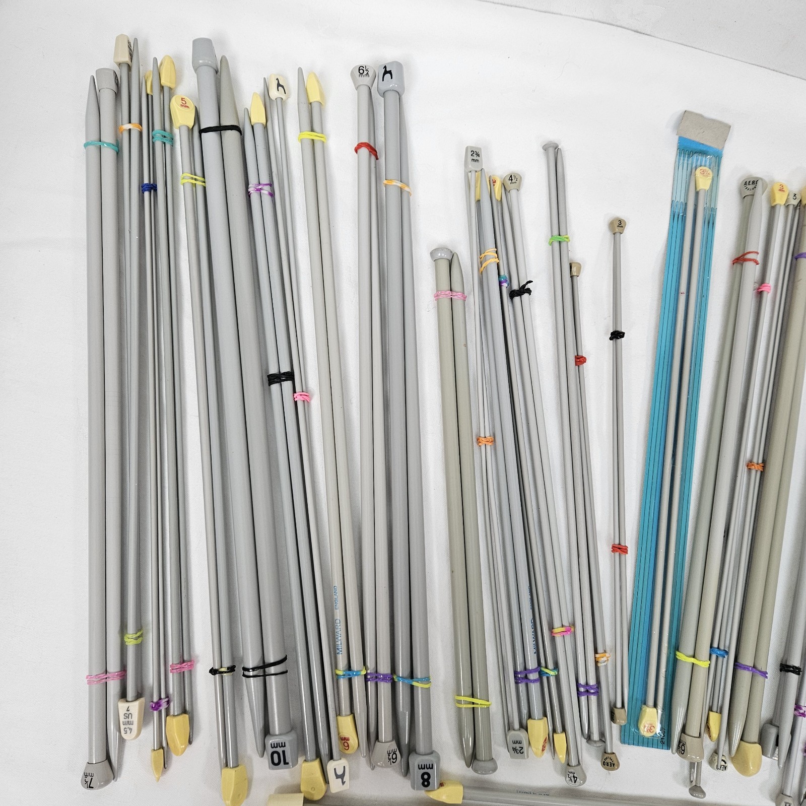 Large mixed job lot of vintage knitting needles and accessories. This bundle includes 30+ pairs of knitting needles in a wide range of sizes and lengths, along with a selection of extras such as circular needles and knitting accessories/tools . Mostly classic aluminium needles with various brands visible (see photos), plus some larger sizes and speciality pieces. A great mixed lot All items are exactly as shown in the photos – a well-balanced mix with potential. Condition Summary Used vintage condition with general signs of wear. Some items are unused/sealed. See photos for full detail.