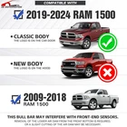 Bull Bar Front Grille Guard Bumper For 09-2018 Dodge Ram 1500 & 19-2024 Classic Please Note that this bull bar may interfere with front-end sensors. Suitable Models : Compatible with 2009-2018 Dodge Ram 1500 & 2019-2024 RAM 1500 Classic ( This won't fit 2019-UP RAM 1500 New Body Style & Rebel/Warlock/Sport Models ) Package Includes : 1 x Long Led Light Bars, 1 x Front Bull Bars, 1 x License Plate Frame Product Information : Product Dimensions : 37.4'' x 7.8'' x 19.7'' Installation mode: Bolt-On With Sensor Holes: No Placement on Vehicle: Front Item Weight: 30.14 Pounds Material: Carbon Steel Color: Black (hand measurements may have an error of 2-3 mm/0.078-0.118 in) Feature : ① Our grille guard comes with 312W long LED light bars and a license plate frame, providing additional lighting for night driving without the need for extra purchases. Our design features pre-drilled slots and holes, allowing for easy removal or replacement if desired; ② Our brush guards feature a special dual-side mesh design and an aggressive-looking logo on the Skid plate. The Skid plate is also removable, adding to the vehicle's wild appearance; ③ Constructed from square carbon steel with a black powder-coated surface, our Bumper Push Bar offers enhanced rust resistance and durability; ④ Direct bolt-on installation using factory holes. Removal of the lower air dam from the front bottom is required, or a slight cutting of the air dam may be necessary ; Warranty Period :2 year Standard Shipping (FedEx Ground or FedEx Home Delivery) Will usually ship within 3 business days of receiving cleared payment Please Note that this bull bar may interfere with front-end sensors. Suitable Models : Compatible with 2009-2018 Dodge Ram 1500 & 2019-2024 RAM 1500 Classic ( This won't fit 2019-UP RAM 1500 New Body Style & Rebel/Warlock/Sport Models ) Package Includes : 1 x Long Led Light Bars, 1 x Front Bull Bars, 1 x License Plate Frame Product Information : Product Dimensions : 37.4'' x 7.8'' x 19.7'' Installation mode: Bolt-On With Sensor Holes: No Placement on Vehicle: Front Item Weight: 30.14 Pounds Material: Carbon Steel Color: Black (hand measurements may have an error of 2-3 mm/0.078-0.118 in) Feature : ① Our grille guard comes with 312W long LED light bars and a license plate frame, providing additional lighting for night driving without the need for extra purchases. Our design features pre-drilled slots and holes, allowing for easy removal or replacement if desired; ② Our brush guards feature a special dual-side mesh design and an aggressive-looking logo on the Skid plate. The Skid plate is also removable, adding to the vehicle's wild appearance; ③ Constructed from square carbon steel with a black powder-coated surface, our Bumper Push Bar offers enhanced rust resistance and durability; ④ Direct bolt-on installation using factory holes. Removal of the lower air dam from the front bottom is required, or a slight cutting of the air dam may be necessary ; Warranty Period :2 year