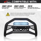 Bull Bar Front Grille Guard Bumper For 2007-2018 Chevy Silverado&GMC Sierra 1500 Please Note that this bull bar may interfere with front-end sensors. Suitable Models : Compatible with 2007-2018 Chevy Silverado & GMC Sierra 1500 / 2007-2020 Chevrolet Tahoe & Suburban / 2007-2020 GMC Yukon & Yukon XL / 2019 Chevy Silverado 1500 LD & GMC Sierra 1500 Limited models ( NOT Compatible for 2019-up Silverado/Sierra 1500 New Body Style or 2007 Classic . ) Package Includes : 1 x Long Led Light Bars, 1 x Front Bull Bars, 1 x License Plate Frame Product Information : Product Dimensions : 37.4'' x 7.8'' x 19.7'' Installation mode: Bolt-On With Sensor Holes: No Placement on Vehicle: Front Item Weight: 27.06 Pounds Material: Carbon Steel Color: Black (hand measurements may have an error of 2-3 mm/0.078-0.118 in) Feature : ① Our grille guard comes with 312W long LED light bars and a license plate frame, providing additional lighting for night driving. Our design features pre-drilled slots and holes, allowing for easy removal or replacement if desired ; ② Our brush guards feature a special dual-side mesh design and an aggressive-looking logo on the Skid plate. The Skid plate is also removable, adding to the vehicle's wild appearance; ③ Constructed from square carbon steel with a black powder-coated surface, our Bumper Push Bar offers enhanced rust resistance and durability. The seamless welding ensures a sturdy structure; ④ Direct bolt-on installation using factory holes. Removal of the lower air dam from the front bottom is required, or a slight cutting of the air dam may be necessary ; Warranty Period :2 year Standard Shipping (FedEx Ground or FedEx Home Delivery) Will usually ship within 3 business days of receiving cleared payment Please Note that this bull bar may interfere with front-end sensors. Suitable Models : Compatible with 2007-2018 Chevy Silverado & GMC Sierra 1500 / 2007-2020 Chevrolet Tahoe & Suburban / 2007-2020 GMC Yukon & Yukon XL / 2019 Chevy Silverado 1500 LD & GMC Sierra 1500 Limited models ( NOT Compatible for 2019-up Silverado/Sierra 1500 New Body Style or 2007 Classic . ) Package Includes : 1 x Long Led Light Bars, 1 x Front Bull Bars, 1 x License Plate Frame Product Information : Product Dimensions : 37.4'' x 7.8'' x 19.7'' Installation mode: Bolt-On With Sensor Holes: No Placement on Vehicle: Front Item Weight: 27.06 Pounds Material: Carbon Steel Color: Black (hand measurements may have an error of 2-3 mm/0.078-0.118 in) Feature : ① Our grille guard comes with 312W long LED light bars and a license plate frame, providing additional lighting for night driving. Our design features pre-drilled slots and holes, allowing for easy removal or replacement if desired ; ② Our brush guards feature a special dual-side mesh design and an aggressive-looking logo on the Skid plate. The Skid plate is also removable, adding to the vehicle's wild appearance; ③ Constructed from square carbon steel with a black powder-coated surface, our Bumper Push Bar offers enhanced rust resistance and durability. The seamless welding ensures a sturdy structure; ④ Direct bolt-on installation using factory holes. Removal of the lower air dam from the front bottom is required, or a slight cutting of the air dam may be necessary ; Warranty Period :2 year