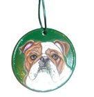 English bulldog portrait is hand painted on a ceramic bisque Christmas ornament, Christmas tree decoration. It measures 3 inch diameter and has a hanging ribbon. Custom orders accepted with a good picture of your pet, before ordering. It can be personalized with the name and year only, due to the limited space. Please order in plenty of time before Christmas as I get very busy after November. Pictures show other breeds available. Price is per one ornament. Copyright.