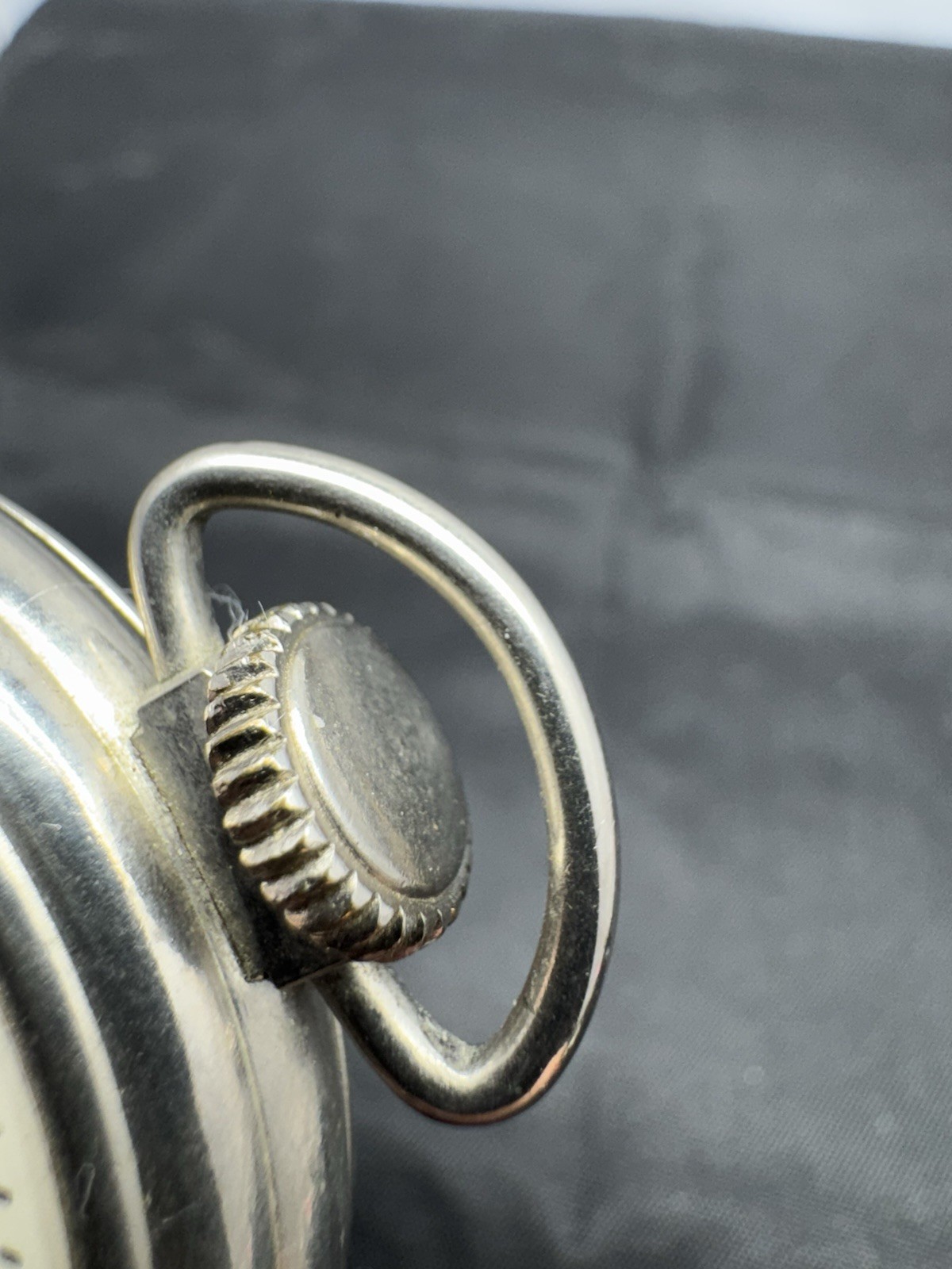 The Bull's Eye Vintage Pocket Watch by Westclox features an open face closure and Arabic numerals on a white dial. This mechanical (manual) watch has a polished silver case with a snap caseback. While it is not currently running, this vintage timepiece is a unique addition to any collection, with a 12-hour dial adding to its charm. Made in the United States, this pocket watch exudes a casual style and is perfect for those interested in classic analog watches.