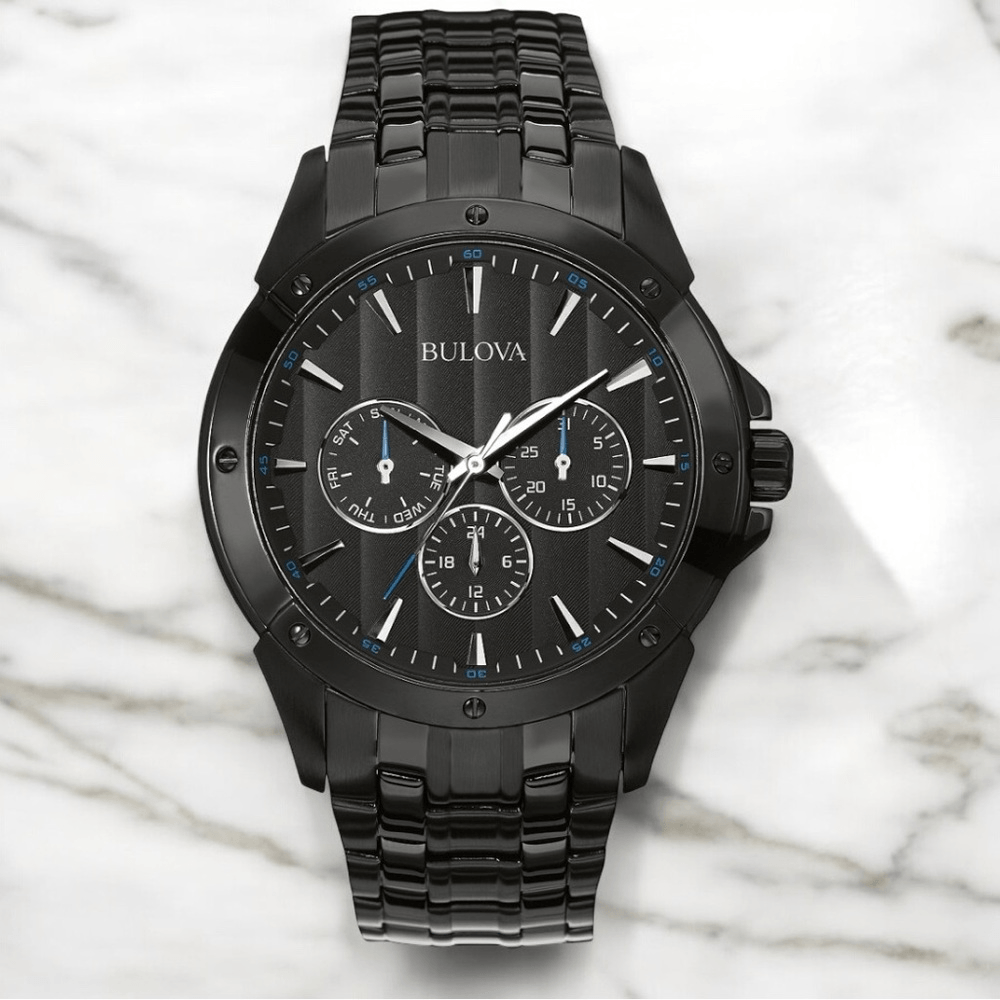 The Bulova 98C121 Multifunction Classic Men's Watch in black with a fold-over push-button deployant closure is a stylish and versatile timepiece. This watch features a black dial with non-numeric hour marks, 21 jewels, and a quartz movement. The stainless steel case and bracelet band add durability and elegance, while the water resistance up to 30 meters ensures practicality. With its classic design and sporty style, this Bulova watch is a perfect choice for everyday wear or special occasions.