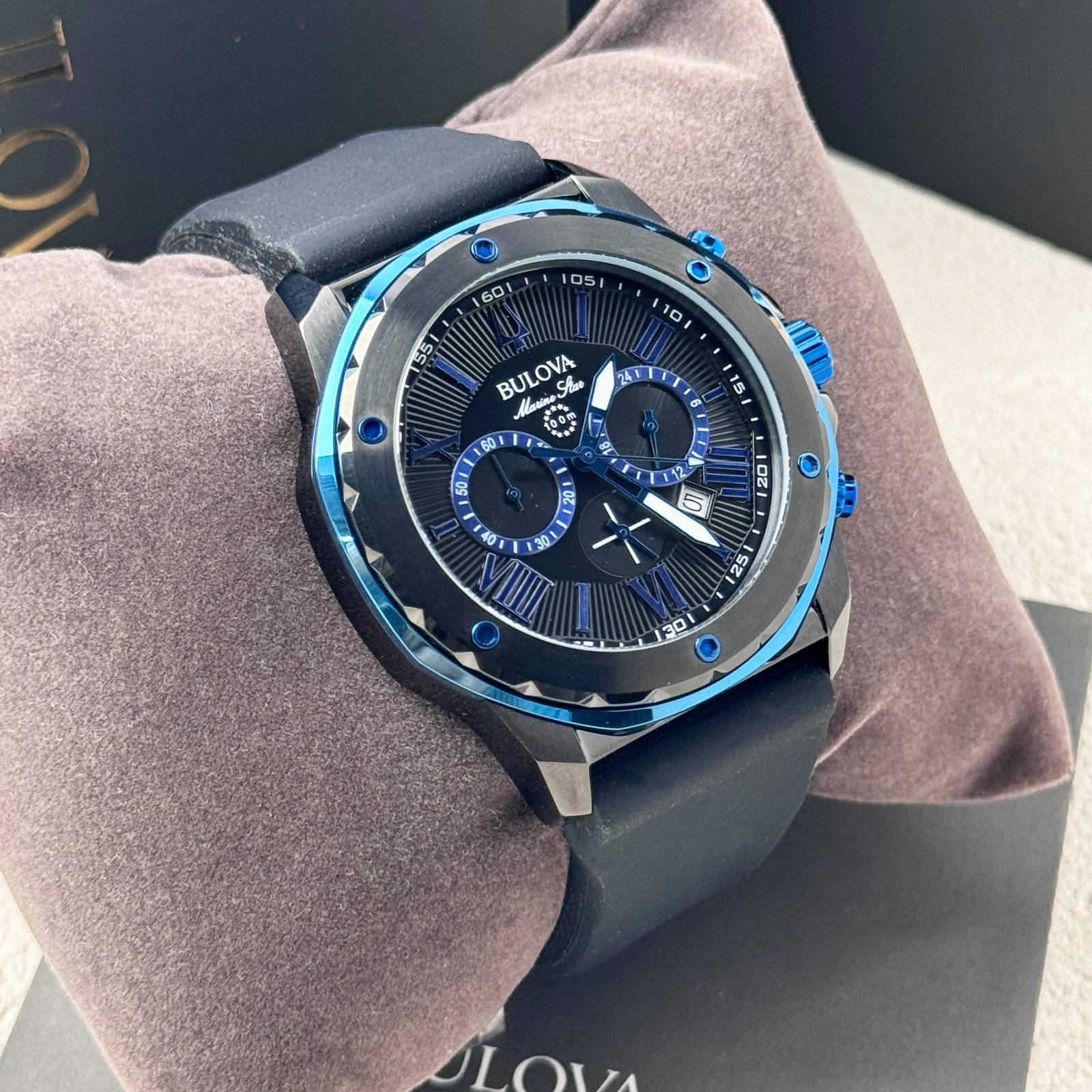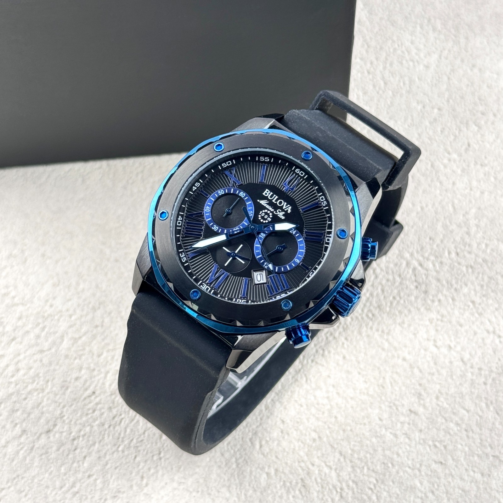 Bulova Men's Marine Star 98B308 Black Dial Silicone Strap Quartz Watch 44mm From the Marine Star Collection. Six-hand chronograph with calendar in black IP stainless steel with black dial, flat mineral glass, screw-back case, black silicone strap with 3-piece buckle closure, and water resistance to 100 meters. Watch movement: Analog Quartz Dial color:Black Band material:Silicone Case material:Stainless Steel Watch crystal material:Mineral Water-resistant depth:100 m Watch band color:Black Watch technology:Chronograph Watch features:Water-Resistant Watch band width:24 mm Case Size:44mm Clasp type:Buckle Watch bezel material:Stainless Steel Shipping & Returns Order processing takes place from Monday to Friday. Orders are usually shipped and customer inquiries are responded to within 24 hours. All weekend orders will be shipped on Monday. We offer a 30-day return and exchange policy. If you receive a damaged product or a product with missing parts, please feel free to contact us.