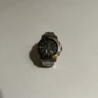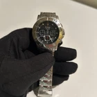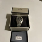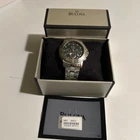 Elevate your style with this stunning Bulova Marine Star Chronograph wristwatch. Crafted in Japan, this round watch features a unidirectional rotating bezel, chronograph function, and a sleek black dial with square indexes. The stainless steel bracelet and silver-tone case add a touch of sophistication to this sporty timepiece. Water-resistant up to 50m, this watch is perfect for everyday wear and outdoor adventures. The fold-over push-button deployant closure ensures a secure fit for wrist sizes up to 7.6-8 inches. Complete with original box, manual/booklet, and papers, this Bulova Marine Star is a must-have for watch enthusiasts.Some light scratches on back and bracelet.