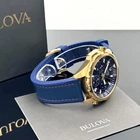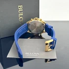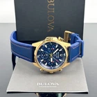 This men's chronograph watch from the Marine Star collection by Bulova showcases a 43mm yellow-gold-tone stainless steel case with a rotating dial ring to measure elapsed time, and a blue dial with yellow-gold-tone accents, three chronograph subdials and a calendar window topped by a flat mineral glass. The blue leather and silicone strap includes red stitch details and secures with a buckle, and the men's watch is water-resistant to 100 meters. Features: Movement: three-hand quartz chronograph Case: round gold-tone stainless steel; 43mm Strap: blue leather & silicone strap Dial: blue chronograph with date window Functions: From Bulova's Men's Marine Star Collection, live and play in maritime watches that feature bold accents, iconic patterns and innovative materials inspired by the sea. 6 Hand, 1/20 Second Chronograph Measures up to 60 Minutes, Calendar, Small Second Hand Gold-Tone Stainless Steel Mineral Crystal 100M Water Resistant and 3 Year Limited Warranty Stainless steel case; mineral crystal Blue dial; six-hand chronograph function; calendar Blue leather strap with three-piece buckle closure A movement powered by a battery. The quartz crystal regulates the time achieving accuracy to 15 seconds a month. Approximate measurements: Band 8"L x 3/4"W; Case 2"L x 2"W Shipping: All items will be shipped within 2 days upon receipt of payment (except weekends and holidays). If Payments are received on weekends or holidays, goods will be shipped on the following business day. Buyer confirms (offers) address & Phone number after order item.If you need to change your address after placing an order, please contact me. We offer expedited service. If you need, please contact us. Returns: We support a 30-day return and exchange policy. If you are not satisfied with the product you received, you can contact us for a return or exchange. In order to be a full refund, less shipping expenses, your returned merchandise must be in its original new condition, as shipped, with all packaging, manuals, and paperwork intact and unaltered.