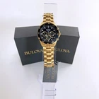 Classic Bulova Gold/Black Marine Star Chronograph Men Quartz 98B406 Watch 41.5mm This Bulova's watches is a striking men's 6-pin chronograph and calendar with exquisite style and exceptional functionality. The gold stainless steel case features a black unidirectional chronograph bezel and domed mineral crystals for extra durability, including 100 meters of water resistance. The dial is a striking black daylight with white and gold accents and illuminated hands and markers. This Ocean Star watch features timing, 24 hours, and a calendar display on the dial, offering utility beyond traditional timepieces. The watch is paired with a gold stainless steel bracelet with live and play in maritime watches that feature bold accents, iconic patterns and innovative materials inspired by the sea. Watch Collection : Marine Star Model: 98B406 Case Width: 41.5mm Lug Width: 22mm Bracelet Width: 20 mm Dial Color: Black Strap Color: Gold Crystal: Mineral Bezel: Fixed Quartz Movement: Automatic Case Material: Stainless Steel Luminous: Hands & Hour Markers Functions: Hour, Minute & Second Bracelet Material: Stainless Steel Clasp Type: Buckle Water Resistant: 100m ( 100 ft ) Features Water Resistance: 100 meters/330 feet Calendar: Date displayed between 4 o'clock and 5 o'clock positions Function: Timer, date, hour, minute, second Watch Features: Chronograph, stainless steel, pointer type Comes with: Gift box for better storage and portability. Transportation: The item will be shipped within 24 hours. Contact: If you have any questions, feel free to contact me at any time I will reply to you as soon as possible.
