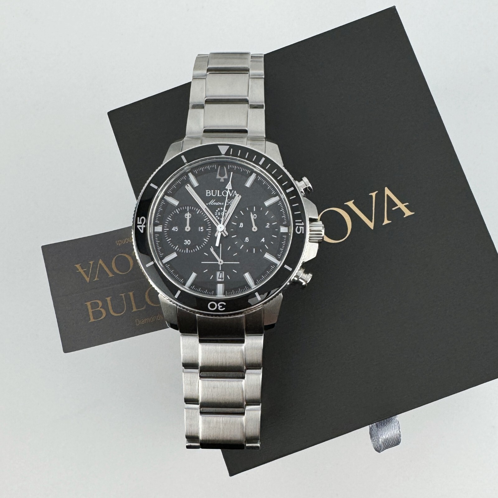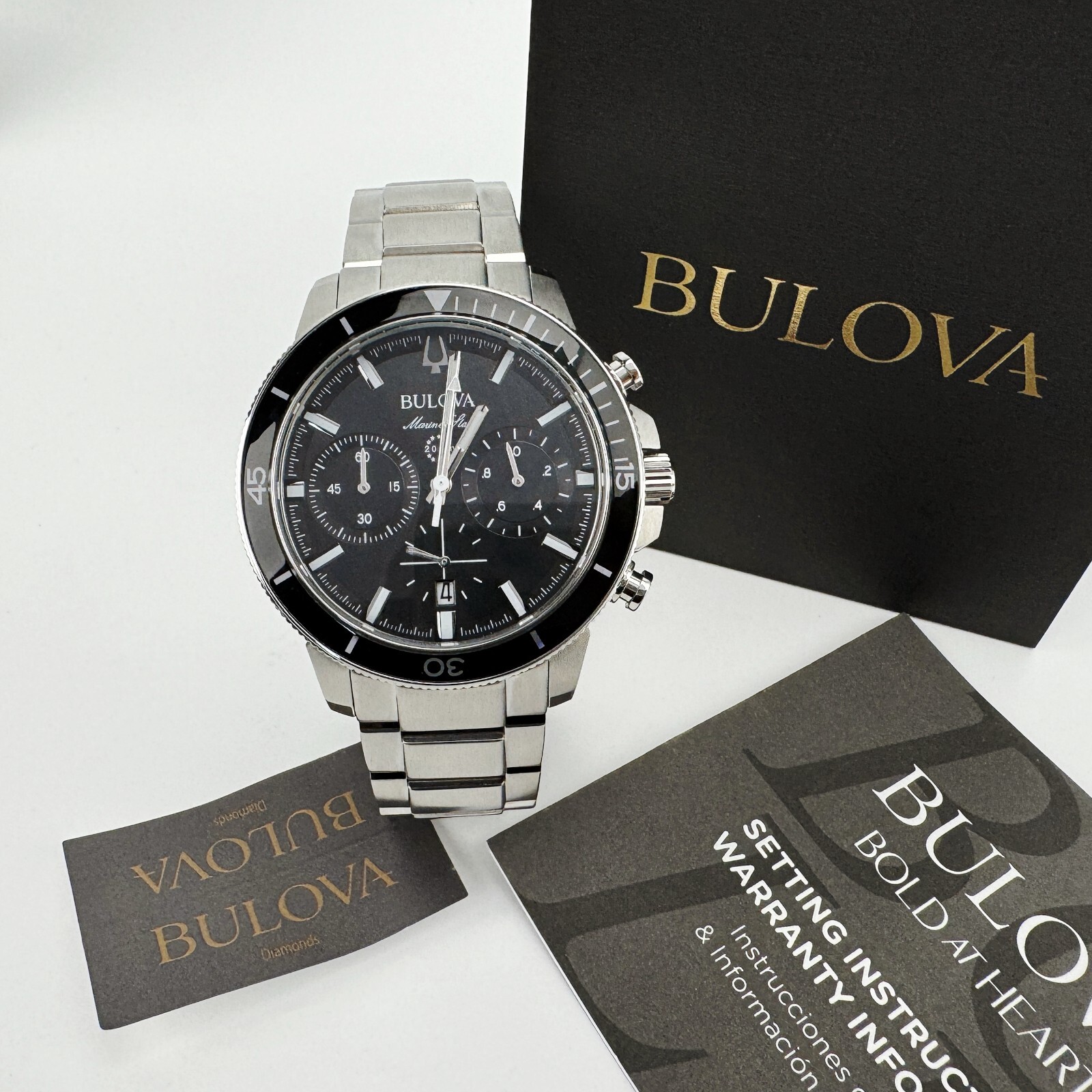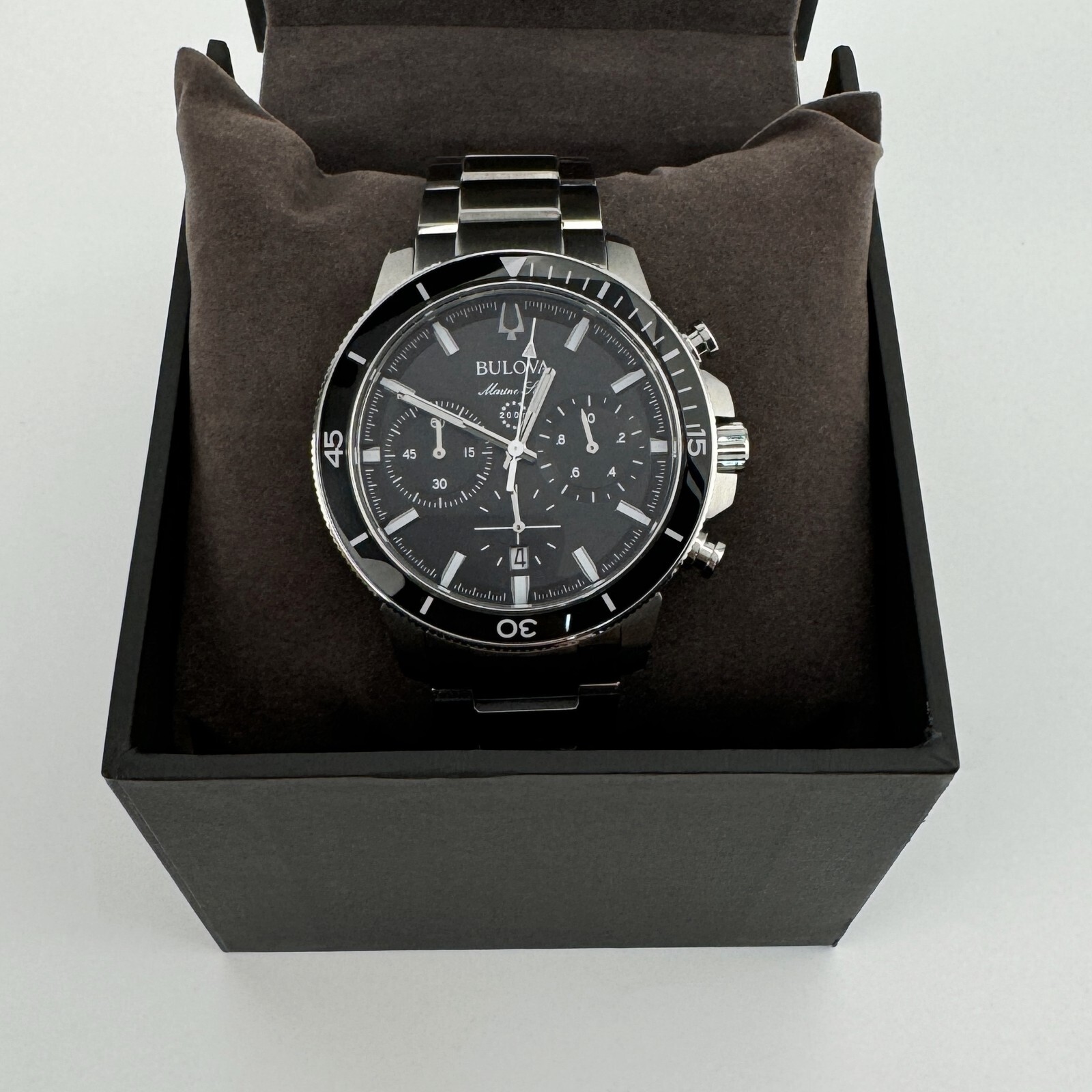 From the Marine Star Collection. New six-hand chronograph movement with 200-meter water resistance. In stainless steel with black glass insert on ratcheted rotating bezel, black dial with luminous hands and markers, and calendar feature, domed mineral crystal, screw-back case, stainless steel bracelet with fold-over buckle closure, safety bar and extender. Quartz Watch, movement powered by a battery. The quartz crystal regulates the time and is water-resistant up to 0200M. Brand new with box We use USPS or UPS with tracking number MODEL 96B272 MOVEMENT 6S20 TECHNOLOGY Quartz A movement powered by a battery. The quartz crystal regulates the time achieving accuracy to 15 seconds a month. CASE WIDTH (MM) 45 LUG WIDTH (MM) 22 DIAL Black Silver-Tone Luminous Hands and Markers STRAP TYPE Bracelet Stainless Steel CASE MATERIAL Silver-Tone Stainless Steel CLASP Safety Fold Over Clasp with Push Buttons CRYSTAL Domed Mineral Crystal Impact and shatter resistant, dome-shaped crystal raised at an angle within the bezel WATER-RESISTANCE 0200M ADDITIONAL FUNCTIONS 6 Hand 1/20 Second Chronograph Measures up to 60 Minutes Calendar Small Second Hand Thanks for shopping at our store! If you are happy with your purchase- we would appreciate a 5-star rating and positive feedback! We answer messages daily, but please allow at least 12 hours for a reply- sometimes it takes us awhile to catch up on after hour messages If you have a shipping related question/request, please put it in the message box at checkout- Once the order is completed, the confirmed address on file cannot be changed.