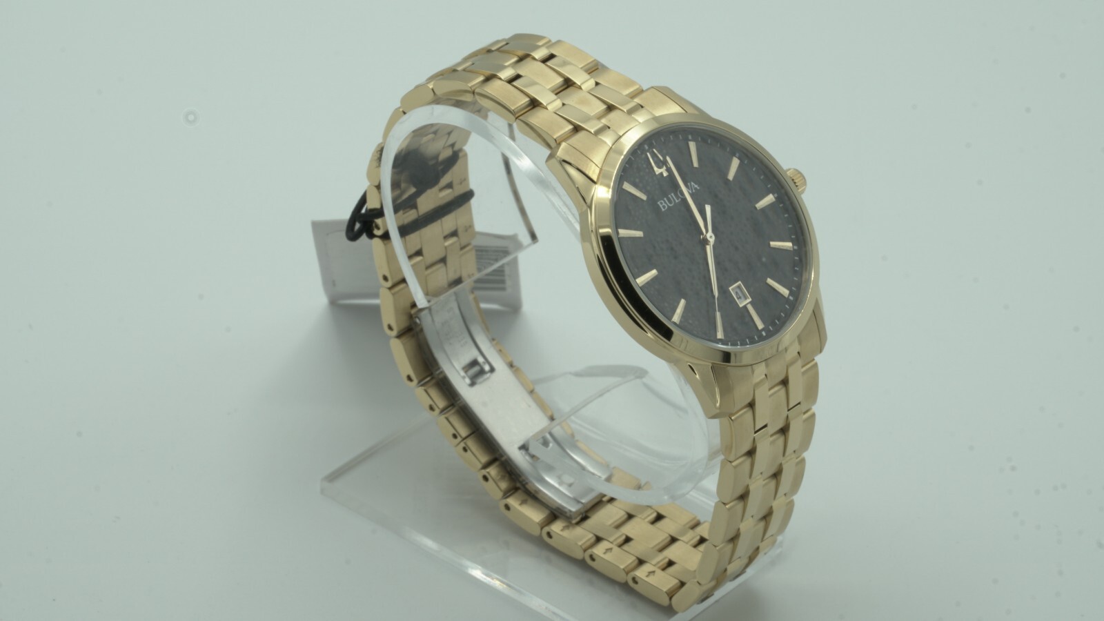 UP FOR AUCTION NEW IN ORIGINAL OPEN BOX Bulova Men's Quartz Stainless Steel Black Dial 39mm 97B194 Elevate your style with this stunning Bulova men's watch. The round 39mm stainless steel case and bracelet are finished in a luxurious gold tone, complemented by a sleek black dial. The watch features a quartz movement, date indicator, and 12-hour dial, making it the perfect accessory for any dress/formal occasion. Water-resistant up to 30m, this watch is as practical as it is stylish.
