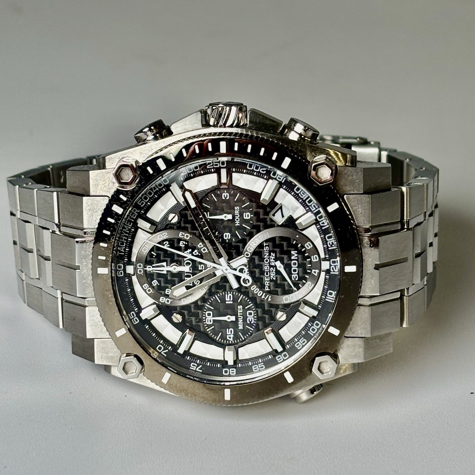 The Bulova Precisionist Chronograph Stainless Steel Quartz Men's Watch 98B405 is a stylish and versatile timepiece suitable for various occasions. With a sleek silver bezel, case, and band, this watch exudes a modern and sophisticated look. The quartz movement ensures accurate timekeeping, while the chronograph feature adds practicality to its design. Packaged in its original box, this watch also includes papers for authenticity. The diver, sport, and casual styles make it a great choice for men looking for a dependable and fashionable accessory.