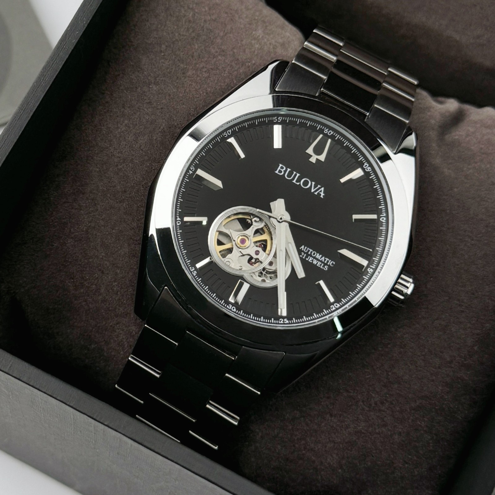 Bulova Surveyor Classic Automatic Black dial Tone Steel Men's Watch 96A274 Description : From the Surveyor collection, this classic automatic watch offers all of the detail and quality you would expect. The stainless steel case and bracelet is paired with a black-tone dial and an open aperture to view the movements balance wheel and escapement. The screw-back case is topped with a mineral crystal exhibition window to showcase the automatic movement powering the timepiece. This beautifully detailed, quality timepiece is destined to become a new favourite in any collection. New Bulova Surveyor Classic Automatic black Tone Steel Men's Watch 96A274: Brand :Bulova Model :Surveyor Model code :96A274 Gender :Mens Dial color :black Case material :Stainless Steel band material :Stainless Steel Case Solid :Caseback band color :silver Case width: 42 mm Lug width :22 mm Deployant Clasp with Push Buttons Luminescent material on the hands Super-LumiNova ® Water Resistant to : 0030M Warranty type :Contact seller Free Shipping: We aim to ship by . Orders placed on weekends and bank holidays will be posted the next business day. Buy with confidence 30-day return policy: At our company we want you to be happy with your purchase, but if you are not, you can return your item and receive a refund. To return an item, please contact us and we will provide you with a return address and return code. Items should be returned within 30 days in their original condition and original packaging with all labels attached. Please obtain proof of postage when returning items as no refund will be given if the item has not been received. Contact Us: Please contact us using eBay's internal messaging system. If you are happy with your order, please remember to leave positive feedback. If you are not satisfied, please contact us and we will do our best to resolve the issue or refund your order. Contact Us Please contact us first before leaving Neutral or Negative feedback. We will do our best to solve the issue. We really appreciate your business and being a great customer.