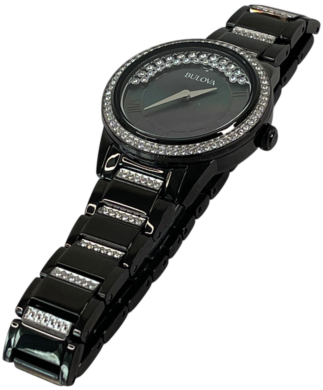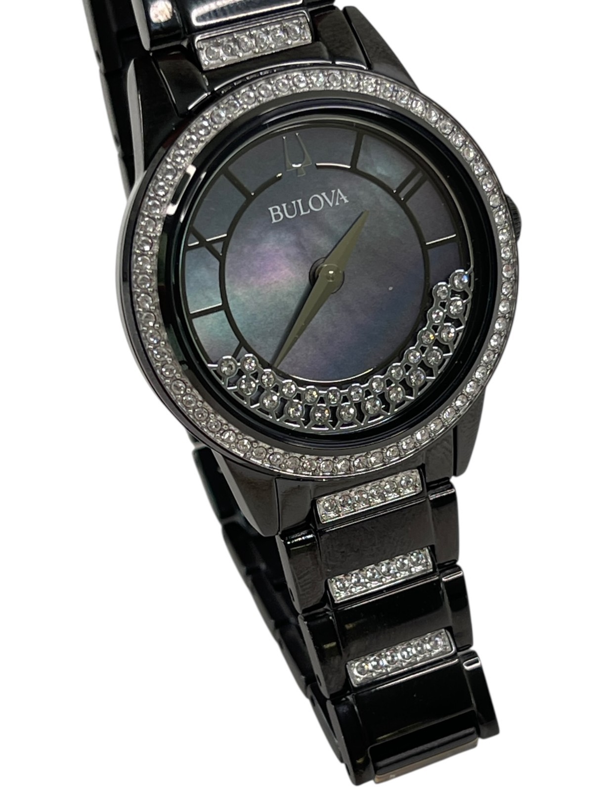 Women's Bulova Turnstyle Quartz Stainless Steel Watch Pearl Silver & Gold 98L252. Display Model / No Packaging, Tags or Paperwork / Excellent Near Flawless Condition / No Issues. Near Flawless Condition (small speck of dust near the 4'oclock positionm, that you can see in the pictures) Black Stainless Steel with Black Mother of Pearl Face Crystal accents in bezel, band, and rotating crystal dial in the face of the watch Classic All Metal Design Comes Exactly as pictured Battery Recently Replaced Shipped in a small box with tracking to ensure fast and safe delivery. Please check our eBay Store for all the other great items we offer. click link >>> Matvey eBay Store! <<< click link Please see the pictures and read the full item description for product details. Please ask any questions you have before purchase. I accept payment through eBay only. I ship with tracking to ensure fast and safe delivery. FREE SHIPPING IN THE USA!