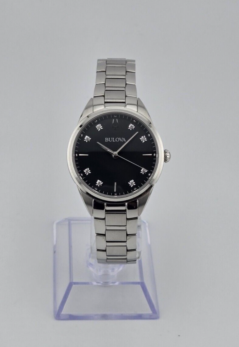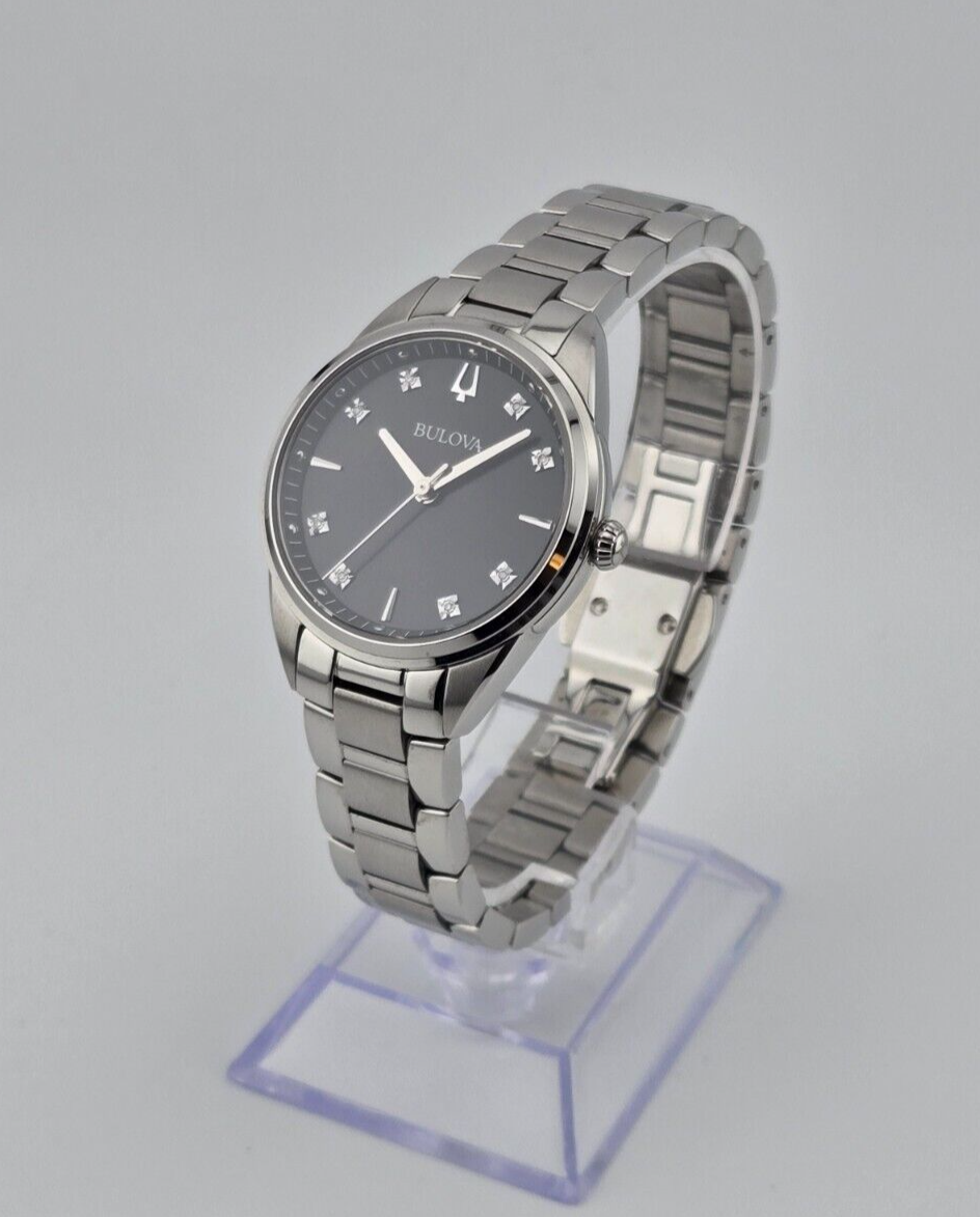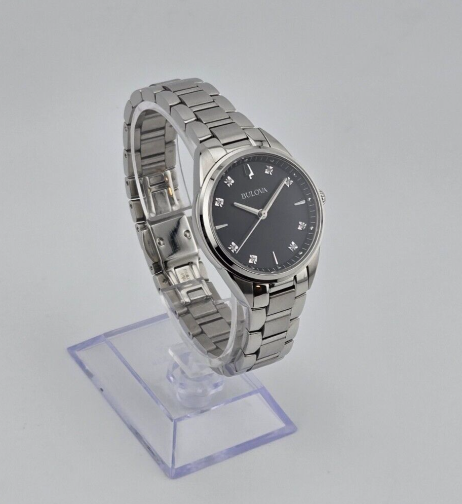 Bulova Women’s Sutton Mother of Pearl Diamond Ladies Watch - 96P198 ($395 MSRP) New with Gift Box! This watch is a Shelf Pull from one of the Major Department Stores. May find few micro scratches on the watch case/band, visible under a direct and strong light. The Bulova Women’s Sutton Mother of Pearl Diamond Ladies Watch (Model: 96P198) is a captivating blend of elegance and functionality, embodying the exquisite craftsmanship for which Bulova is renowned. With a heritage of pioneering advancements in the watchmaking industry, Bulova continues to create timepieces that are both innovative and timeless. This particular model is designed to meet the sophisticated tastes of modern women who appreciate luxury and precision. The watch features a sleek 32.5 mm round case made of durable stainless steel, which complements the silver stainless steel band. The combination of these materials ensures both longevity and a polished aesthetic that suits any occasion. The dial, crafted from black Mother of Pearl (MOP), adds a layer of depth and iridescence that captures light beautifully, enhancing the watch's overall allure. Accentuating the dial are diamond markers, which provide a touch of sparkle and elevate the watch's elegance. Practical as well as stylish, the Bulova Sutton 96P198 is equipped with a push-and-pull crown and boasts a water resistance of up to 30 meters (3 ATM), making it suitable for everyday wear and able to withstand occasional splashes. The analog display, driven by reliable quartz movement, ensures precise timekeeping. This timepiece is a perfect blend of luxury and functionality, making it an ideal accessory for the discerning woman who values both style and substance in her wardrobe. Features Case Diameter : 32.5 mm Watch shape : Round Case Material : Stainless Steel Case Color : Silver Band Material : Stainless Steel Band Color : Silver Dial Color : Black MOP Mother of Pearl Crown : Push and Pull Water Resistance : 30 meters - 3 ATM Fast and Free Shipping You're already purchasing the item. Why pay additional for shipping, especially slow shipping? We get your order shipped out within 1-business day and delivered to your doorstep as quickly as possible. Competitive Pricing With our dynamic pricing model, our prices are always competitive. Our prices are some of the lowest that you will find on the internet. Rest assured that you're getting a good deal when purchasing with us. 30-day Money Back Guarantee We are committed to making sure that you leave this transaction satisfied. If you're unhappy with the product for any reason, you may return it back for your money-back or a replacement within 30 days. No questions asked!